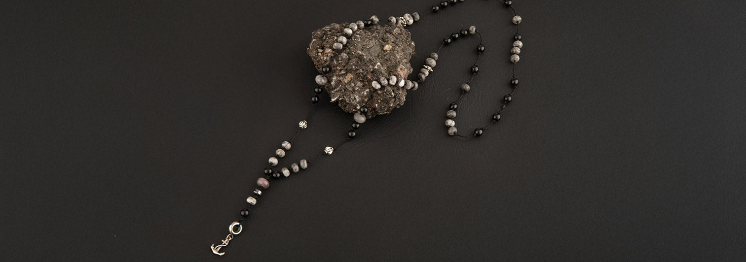 Erkek Kolyesi Fosil Mercan-Şungit-Meksika Jasper-Hematit Doğal Taş Gümüş Tasarım Kolye