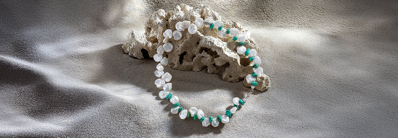 Sertifikalı İnci, Yeşil Larimar, Hematit Gümüş Lale Aparatlı Doğal Taş Kolye (SK:017)