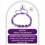 Ametist doğal taşının büyüleyici mor rengi ve dinginleştirici enerjisiyle tasarlanan bu özel bileklik, hem şık bir aksesuar hem de güçlü bir tılsım. Merdiven kapama tekniği ile işlenen doğal taşların her biri, doğanın sanatını yansıtıyor. İpli ve ayarlanabilir yapısıyla her bileğe rahatça uyum sağlıyor.