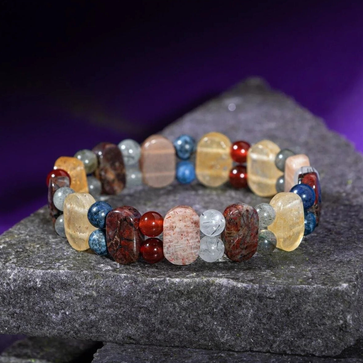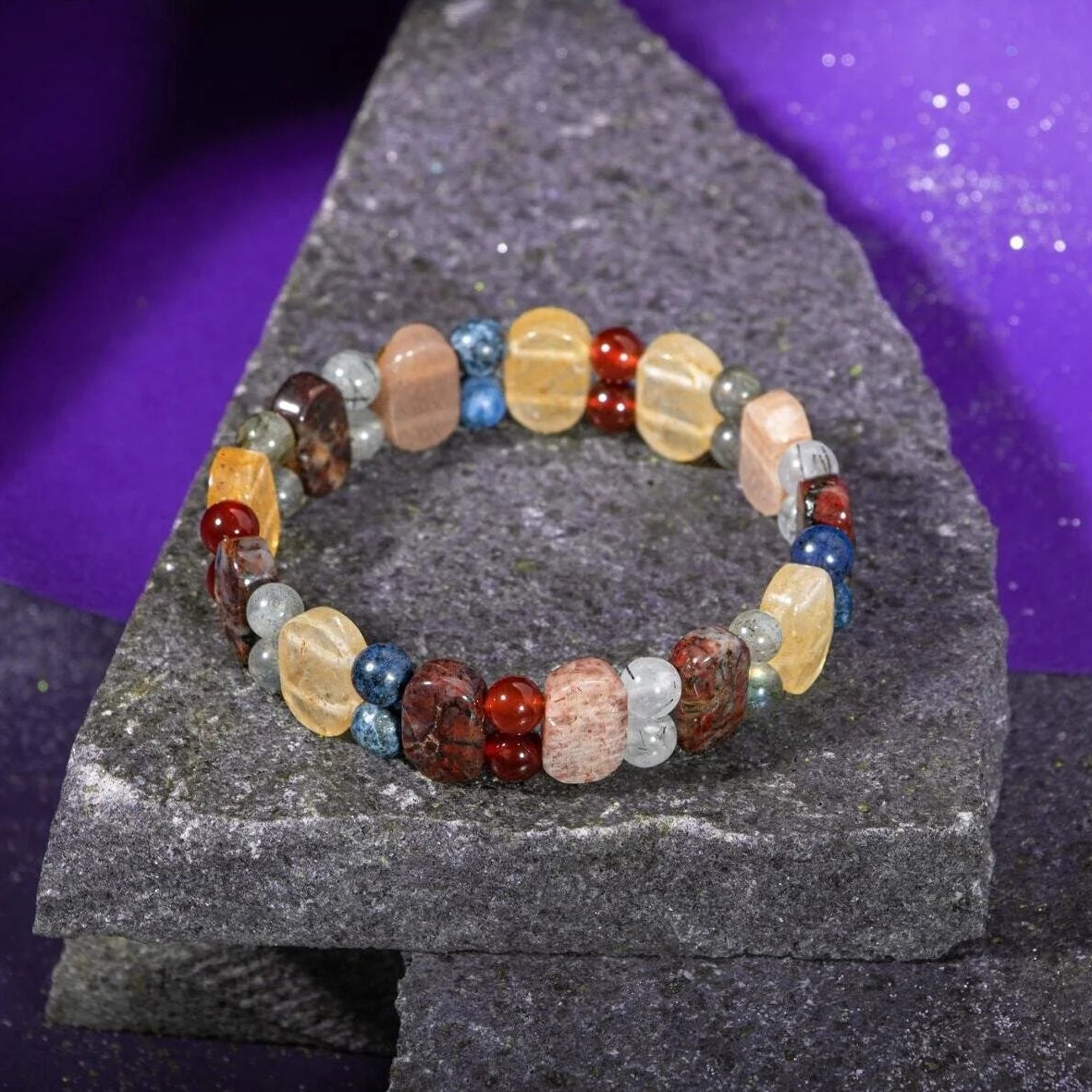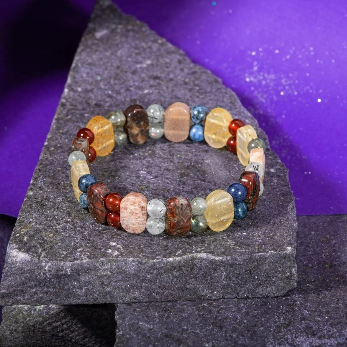 Aslan Burcu Bileklik Bronzit, Dumortierit, Güneş Taşı, Jasper, Kırmızı Akik, Labradorit, Rutilli Kuvars, Sitrin