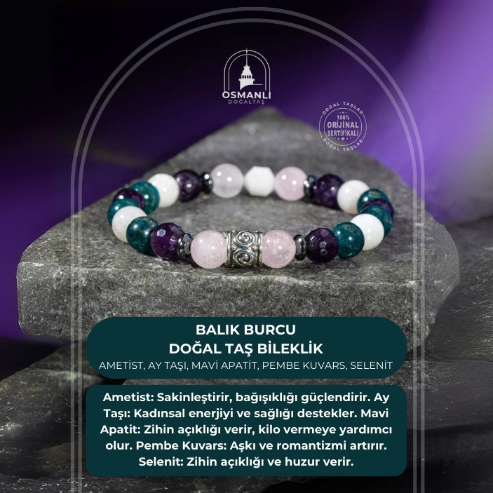 Balık Burcu Bileklik Ametist, Ay Taşı, Mavi Apatit, Pembe Kuvars, Selenit