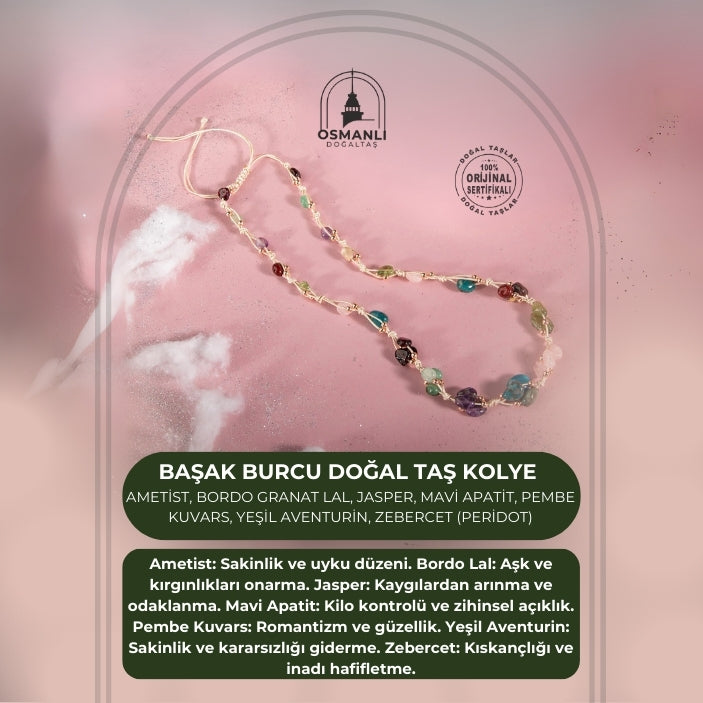 Başak Burcu Kolye Ametist, Bordo Granat Lal, Jasper, Mavi Apatit, Pembe Kuvars, Yeşil Aventurin, Zebercet (Peridot)