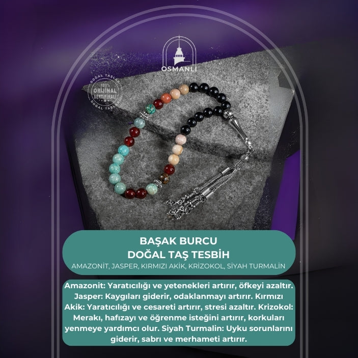 Başak Burcu Tesbih Amazonit, Jasper, Kırmızı Akik, Krizokol, Siyah Turmalin