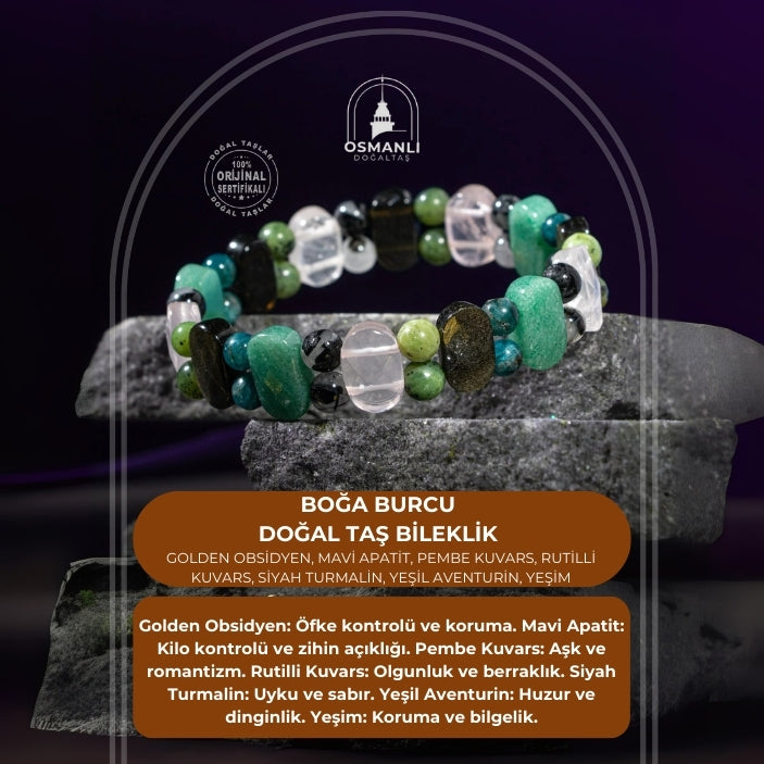 Boğa Burcu Bileklik Golden Obsidyen, Mavi Apatit, Pembe Kuvars, Rutilli Kuvars, Siyah Turmalin, Yeşil Aventurin, Yeşim