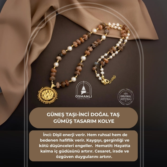 Güneş Taşı-İnci Doğal Taş Gümüş Tasarım Kolye - 60cm