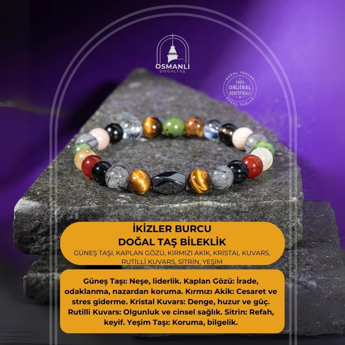 İkizler Burcu Bileklik Güneş Taşı, Kaplan Gözü, Kırmızı Akik, Kristal Kuvars, Rutilli Kuvars, Sitrin, Yeşim
