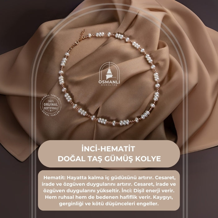 İnci-Hematit Doğal Taş Gümüş Kolye