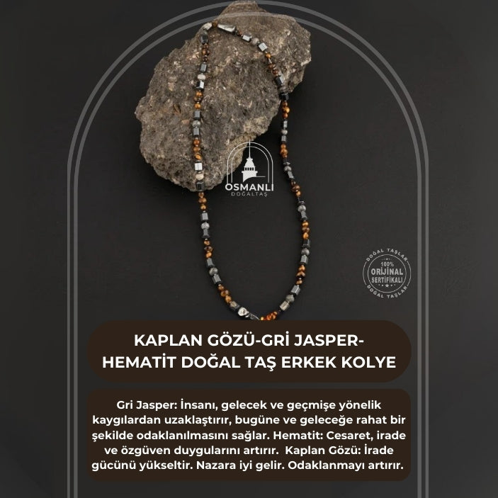 Kaplan Gözü-Gri Jasper-Hematit Doğal Taş Erkek Kolye