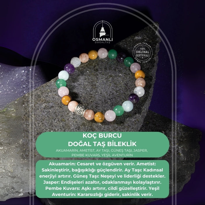 Koç Burcu Bileklik Akuamarin, Ametist, Ay Taşı, Güneş Taşı, Jasper, Pembe Kuvars, Yeşil Aventurin