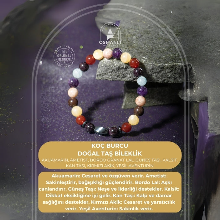 Koç Burcu Bileklik Akuamarin, Ametist, Bordo Granat Lal, Güneş Taşı, Kalsit, Kan Taşı, Kırmızı Akik, Yeşil Aventurin