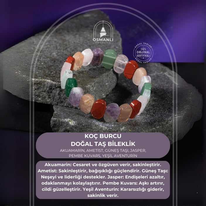 Koç Burcu Bileklik Akuamarin, Ametist, Güneş Taşı, Jasper, Pembe Kuvars, Yeşil Aventurin