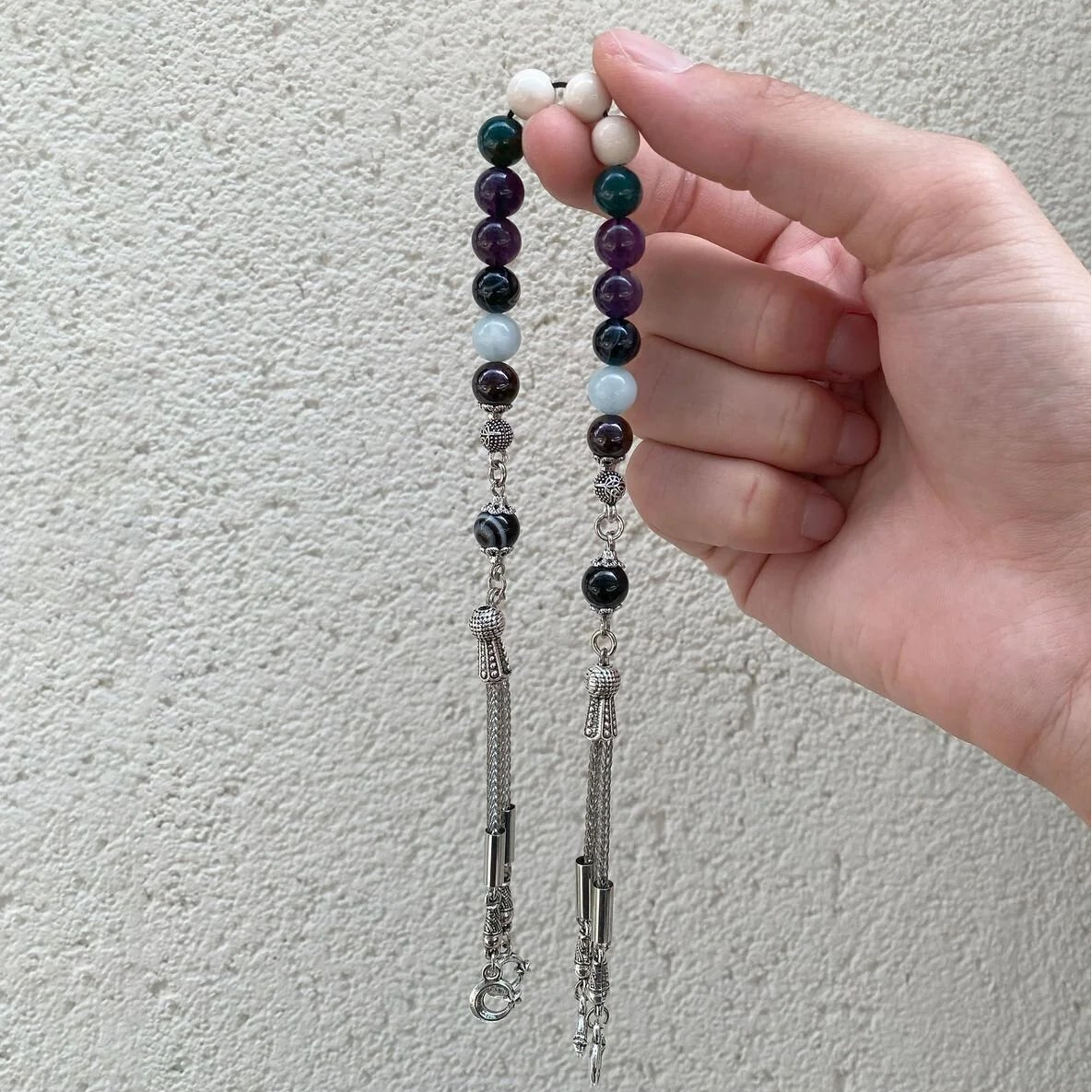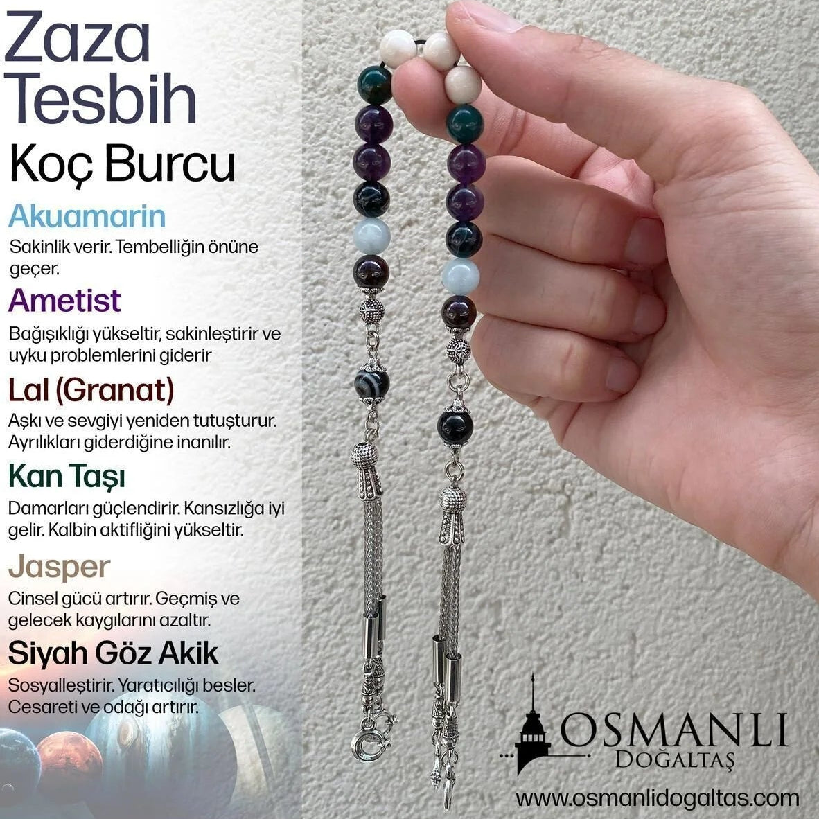 Koç Burcu Zaza Tesbih Doğal Taş Akuamarin, Ametist, Bordo Granat Lal, Kan Taşı, Sarı Jasper, Siyah Göz Akik