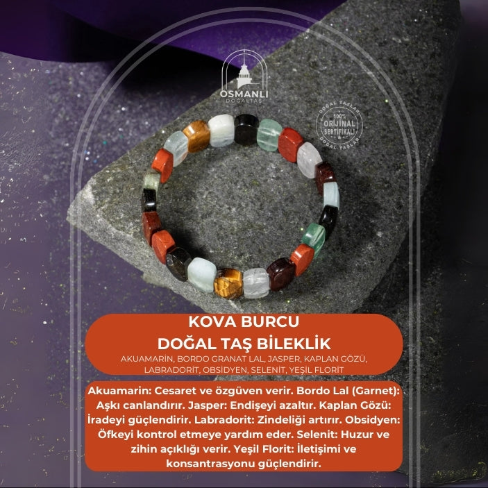 Kova Burcu Bileklik Akuamarin, Bordo Granat Lal, Jasper, Kaplan Gözü, Labradorit, Obsidyen, Selenit, Yeşil Florit