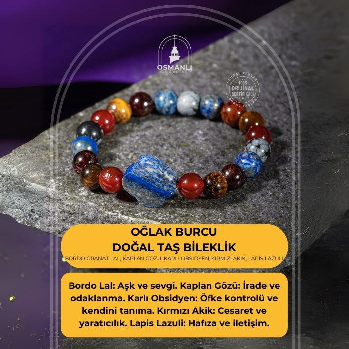 Oğlak Burcu Bileklik Bordo Granat Lal, Kaplan Gözü, Karlı Obsidyen, Kırmızı Akik, Lapis Lazuli