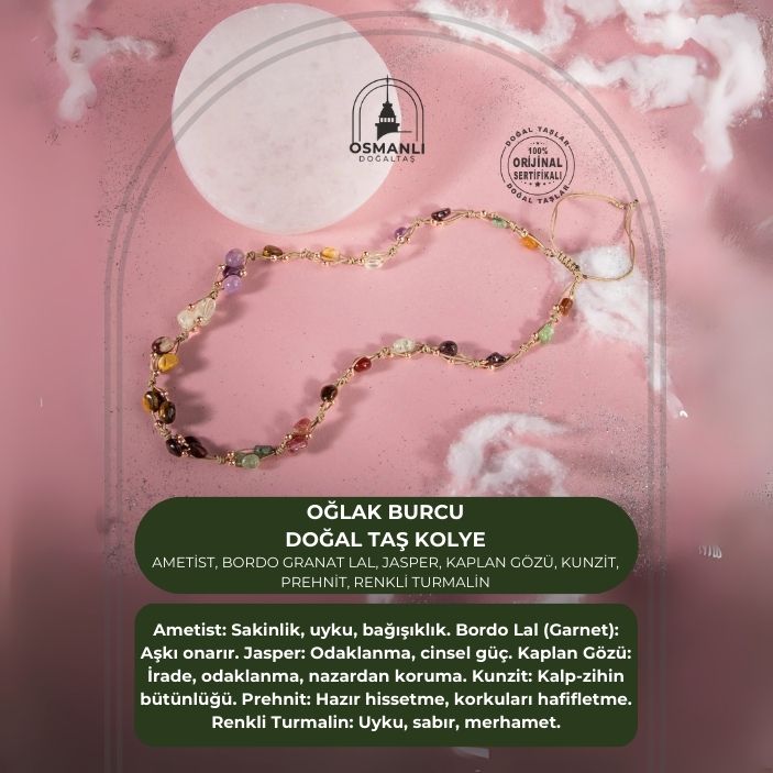 Oğlak Burcu Kolye Ametist, Bordo Granat Lal, Jasper, Kaplan Gözü, Kunzit, Prehnit, Renkli Turmalin