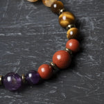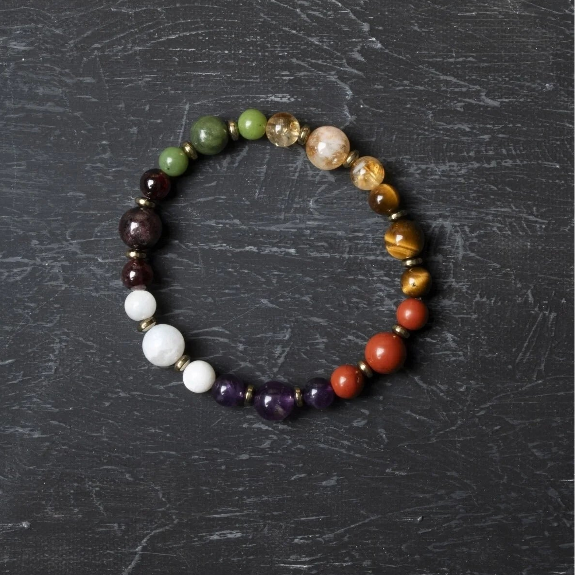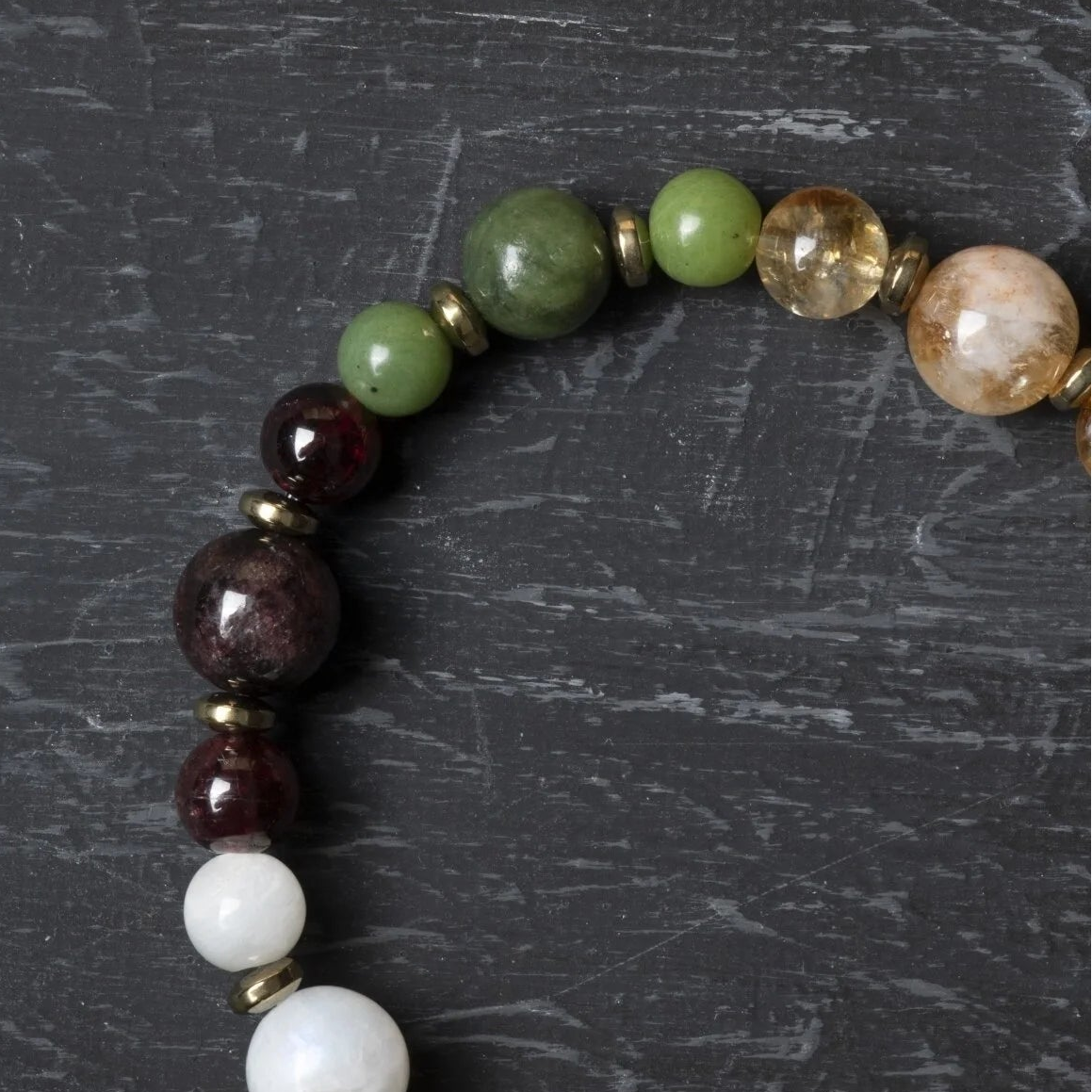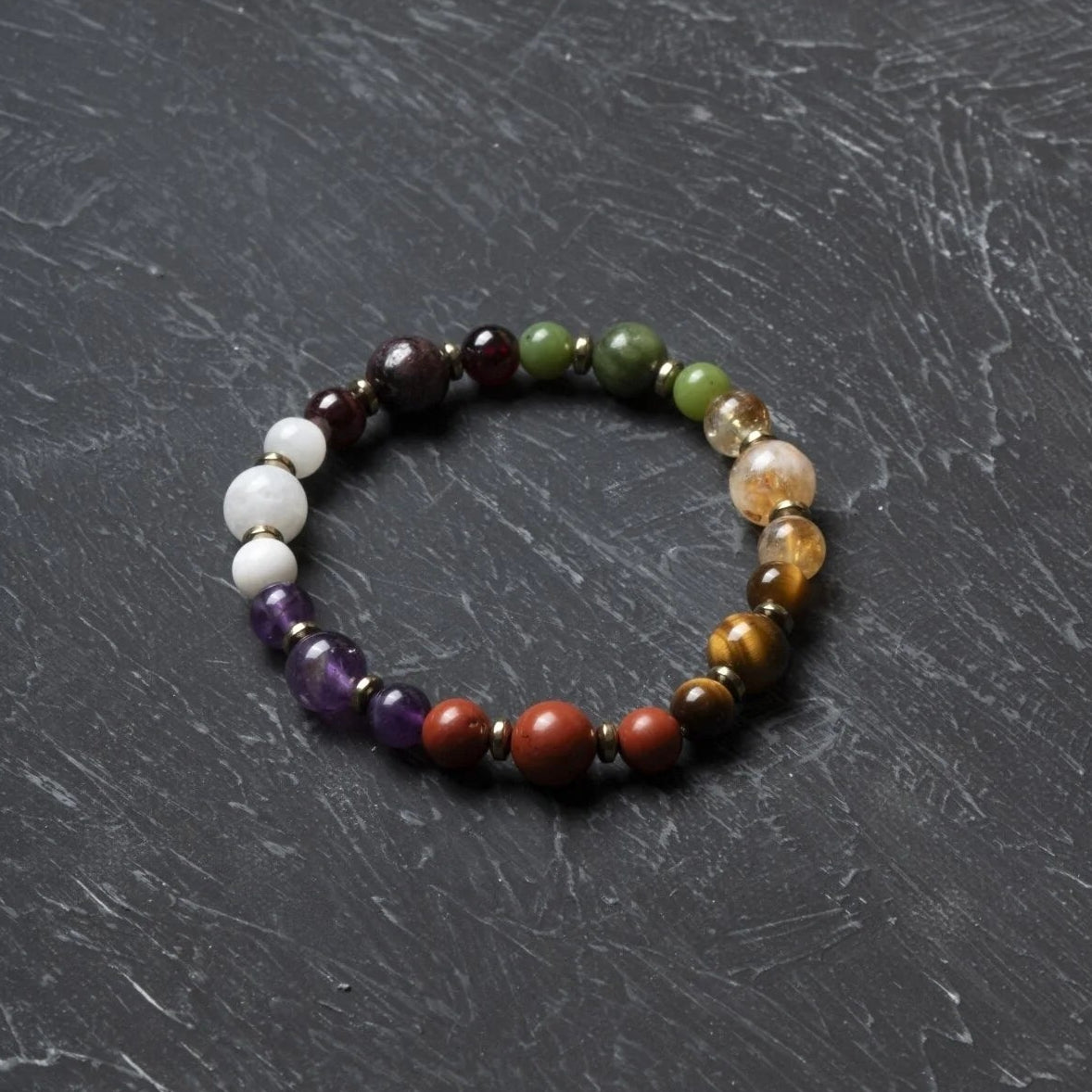 Birim fiyat başınaAkrep burcunun tutkulu, sezgisel ve güçlü enerjisini taşıyan bu özel bileklik, Jasper, Kaplan Gözü, Sitrin, Yeşim, Ay Taşı ve Lal gibi doğal taşların eşsiz birleşiminden oluşmaktadır.