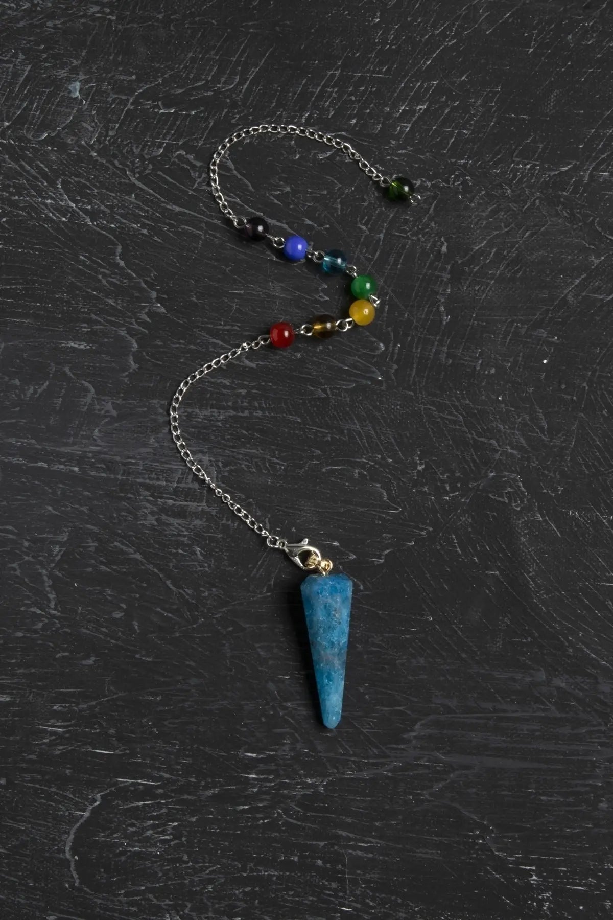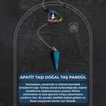 Mavi renginin sakinleştirici enerjisi ile stres ve gerginliği azaltır, iletişimi güçlendirerek özgüveninizi artırmaya yardımcı olur. Günlük hayatınızda taşıyabileceğiniz zarif tasarımı ile Apatit pandül, aynı zamanda şık bir aksesuardır.