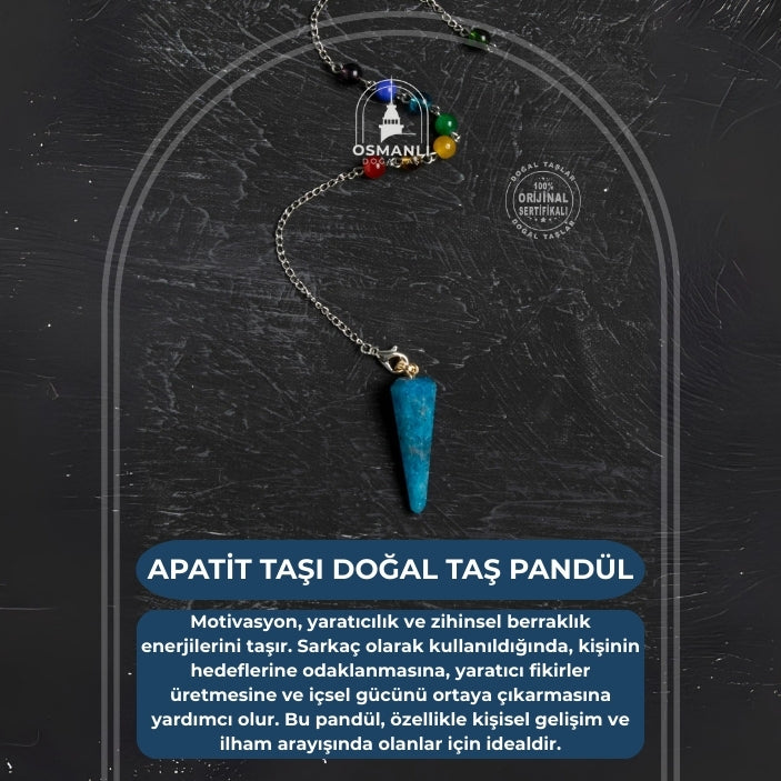 Enerji ve motivasyon taşı olarak bilinen Apatit pandül, yaratıcılığınızı ve sezgilerinizi artırarak yaşamınıza pozitif enerji getirir. Düşünceleri netleştirip zihinsel odaklanmayı güçlendiren bu özel taş, meditasyon ve spiritüel çalışmalarınızda etkili bir yardımcıdır.