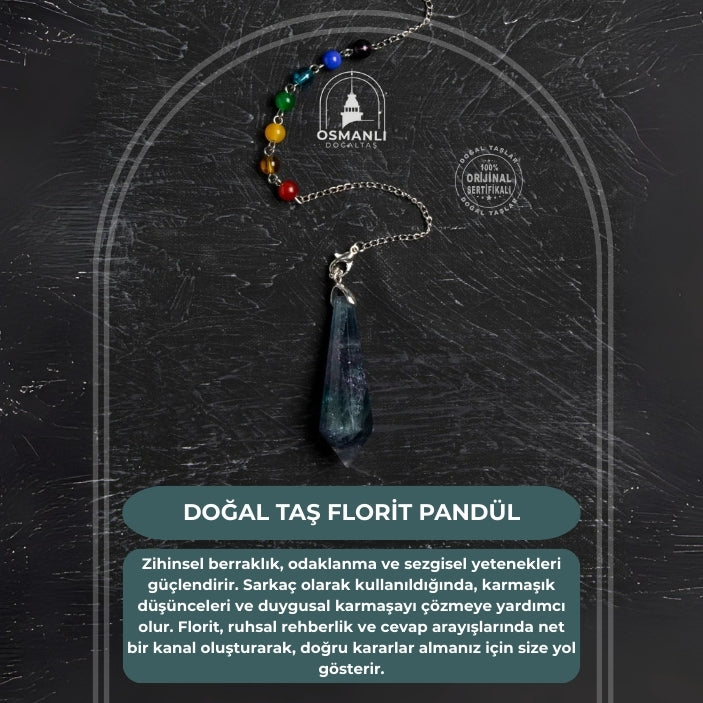 Her bir ürünümüz orijinal ve sertifikalı florit taşından özel olarak hazırlanmıştır. Zarif zincir ve çakra renklerini taşıyan boncukları ile tasarımı tamamlanan pandülümüz, şıklığının yanı sıra enerji çalışmalarınızda güçlü bir yardımcıdır.
