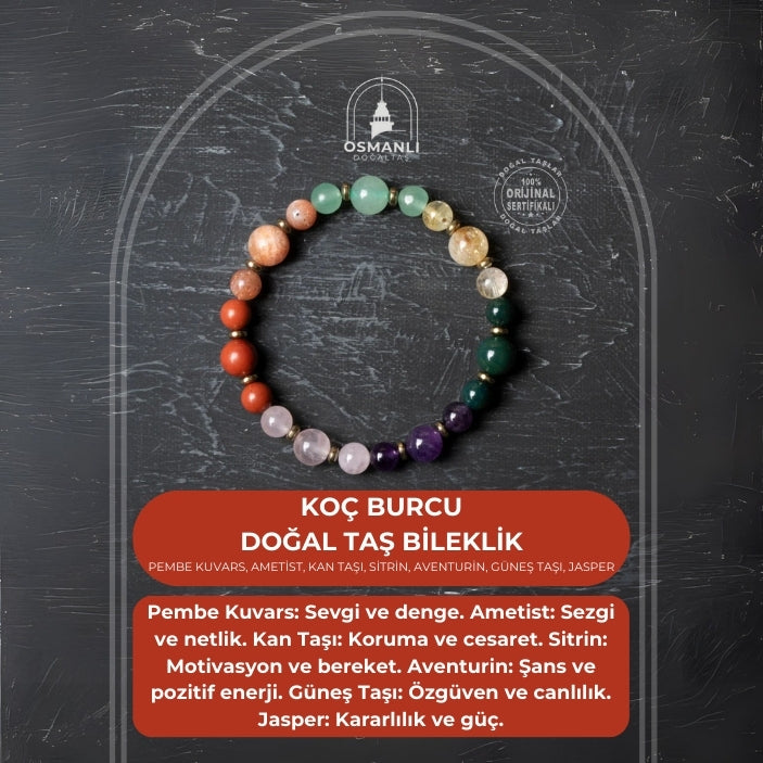 Osmanlı Doğal Taş güvencesiyle tamamen doğal taşlardan hazırlanan bilekliğiniz, taşların orijinalliğini belgeleyen sertifikası ve özel hediye kutusuyla birlikte gönderilir. Koç burcu sevdiklerinize ya da kendinize anlam dolu, güçlü ve şık bir armağan sunun.