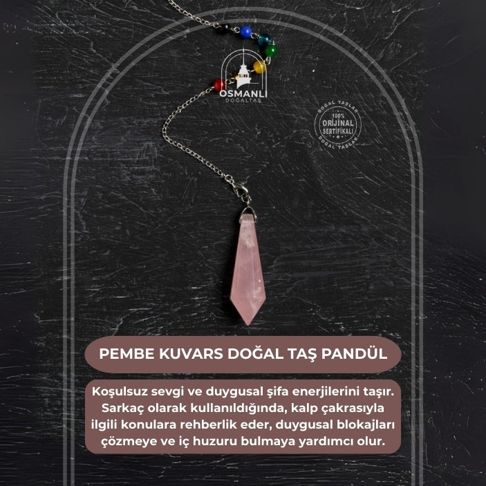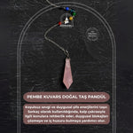 Doğal pembe kuvars taşından özenle tasarlanmış bu pandül, meditasyon, enerji çalışmaları ve duygusal dengeleme uygulamalarında sıklıkla tercih edilir. Yumuşak rengi ve şıklığı ile zarif bir aksesuar olarak günlük yaşamınızda da kullanabilirsiniz.