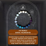Yay burcunun özgür, maceracı ve pozitif ruhunu yansıtan bu özel bileklik; Ametist, Akuamarin, Kalsedon, Apatit, Akik, Labradorit ve Sedef taşlarının eşsiz enerjisini bir araya getiriyor. Yay burcunun iyimser ve meraklı doğasını desteklemek, sezgileri güçlendirmek ve içsel dengeyi sağlamak için özenle hazırlandı.
