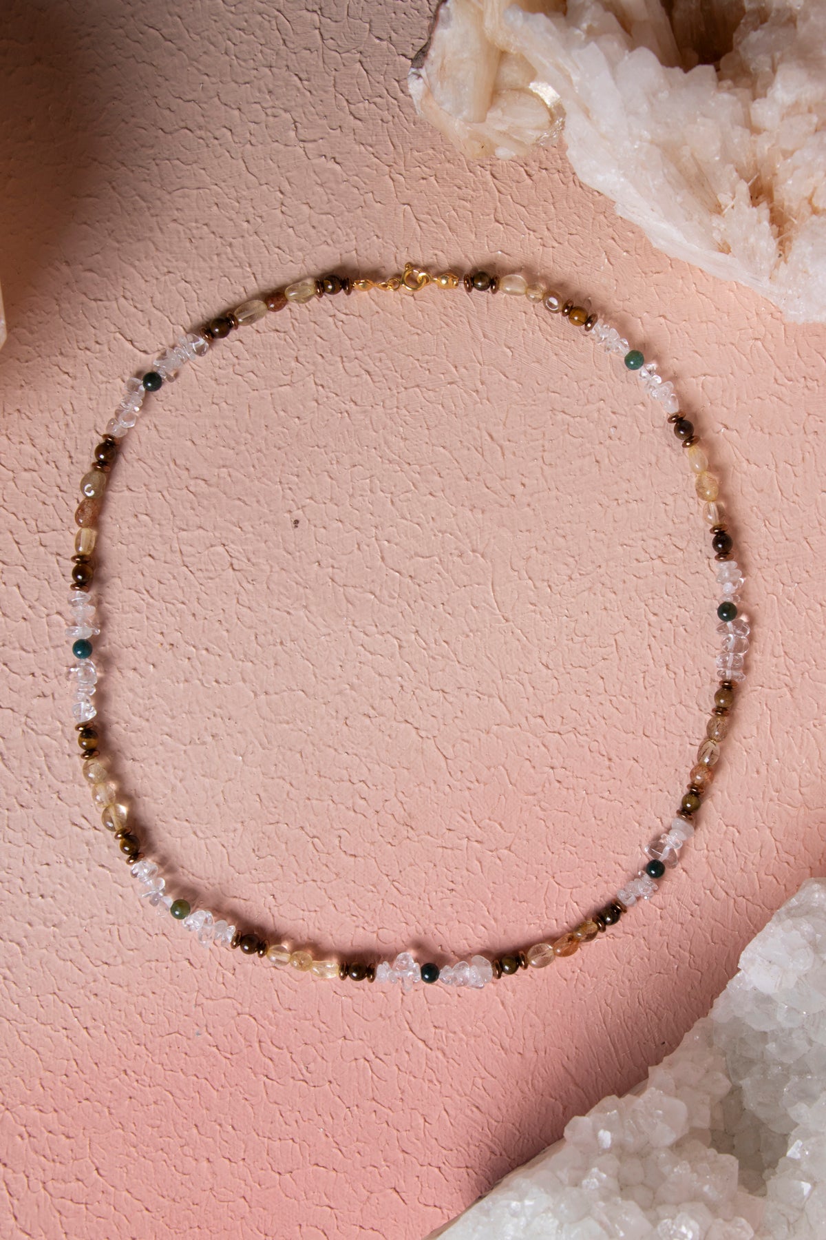 Enerji yükseltme, zihinsel berraklık, koruma ve şans gücünü tek bir kolyede birleştirin. Kristal Kuvars'ın arındırıcı gücü, Rutilli Kuvars'ın aydınlatıcı etkisi, Kaplan Gözü'nün cesareti ve Yeşil Akik'in dengelemesi, şık bir Gümüş Kapama detayıyla bu özel kolyede buluşuyor. Bu kolye, size bütünsel bir denge, odaklanma ve güçlü bir destek sağlayan dinamik bir enerji kaynağıdır.