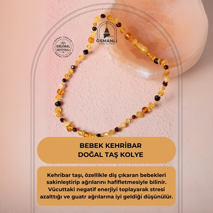 %100 doğal ve sertifikalı Kehribardan üretilen bu kolye, bebeklerin büyüme sürecinde karşılaştığı huzursuzluklara karşı doğal bir destek sunar.