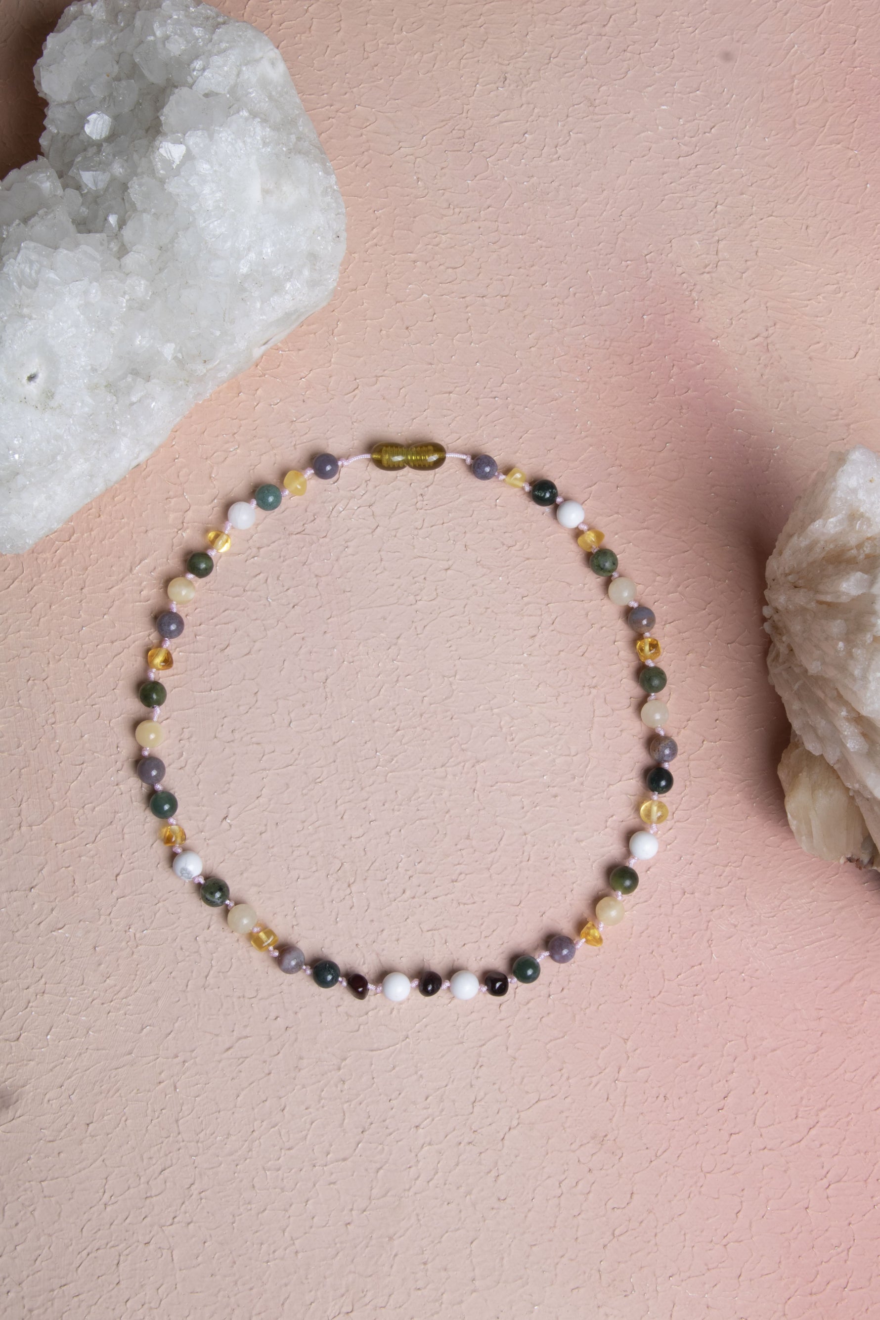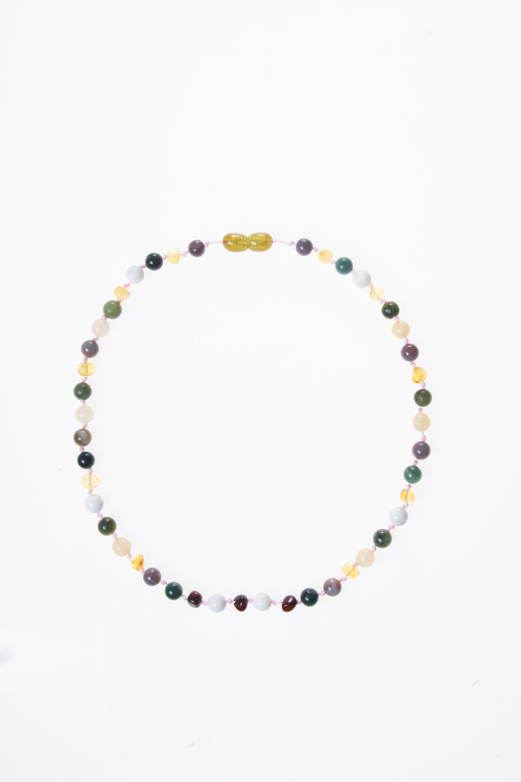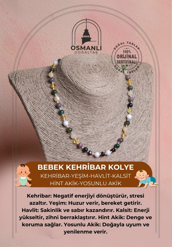Sertifikalı Bebek Kehribar Kolye-Kehribar, Yeşim, Havlit, Kalsit, Hint Akik, Yosunlu Akik