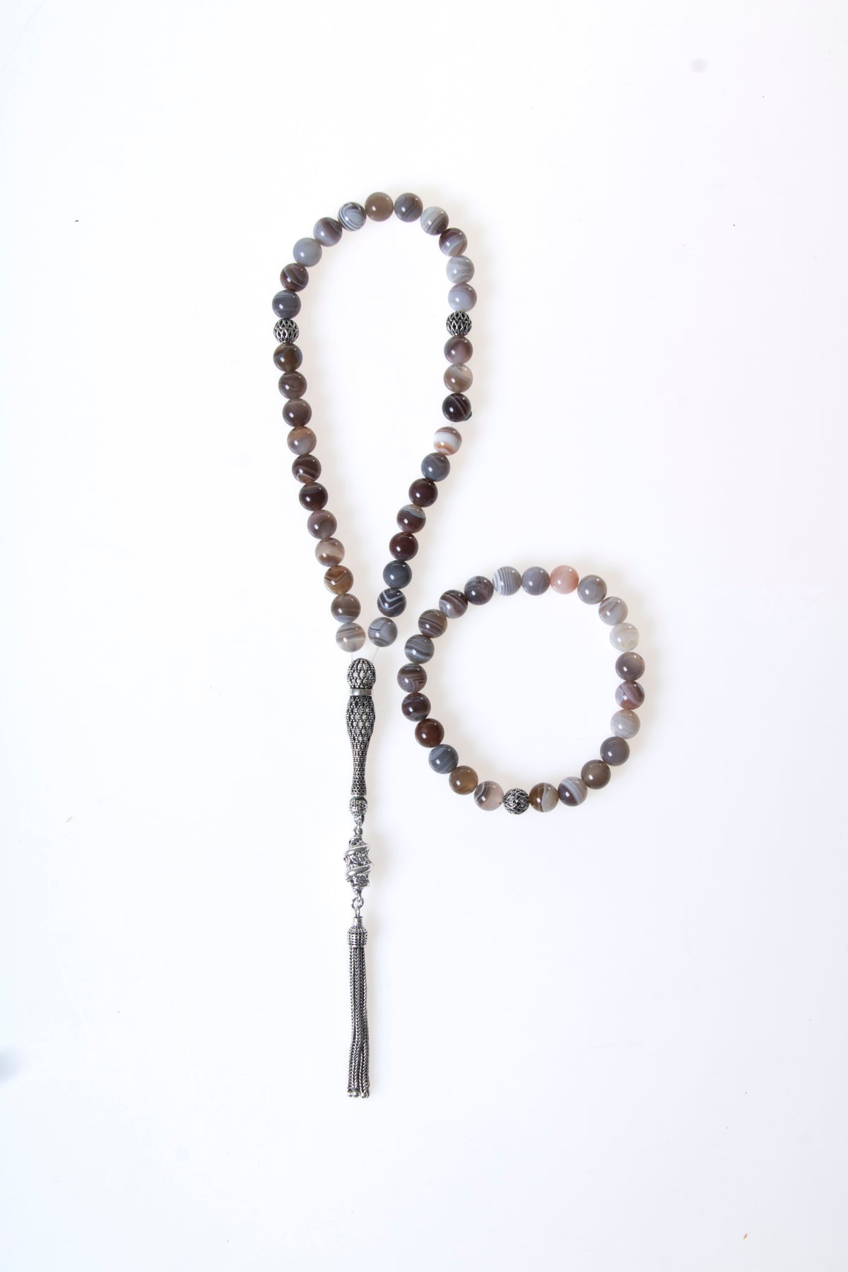 Sertifikalı Botsvana Akik 925 Ayar Gümüş 8 mm İmameli Tesbih & Bileklik Seti