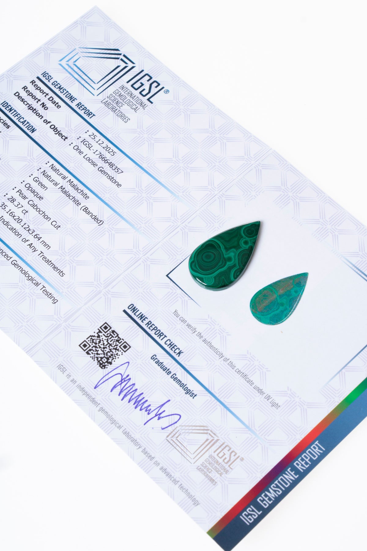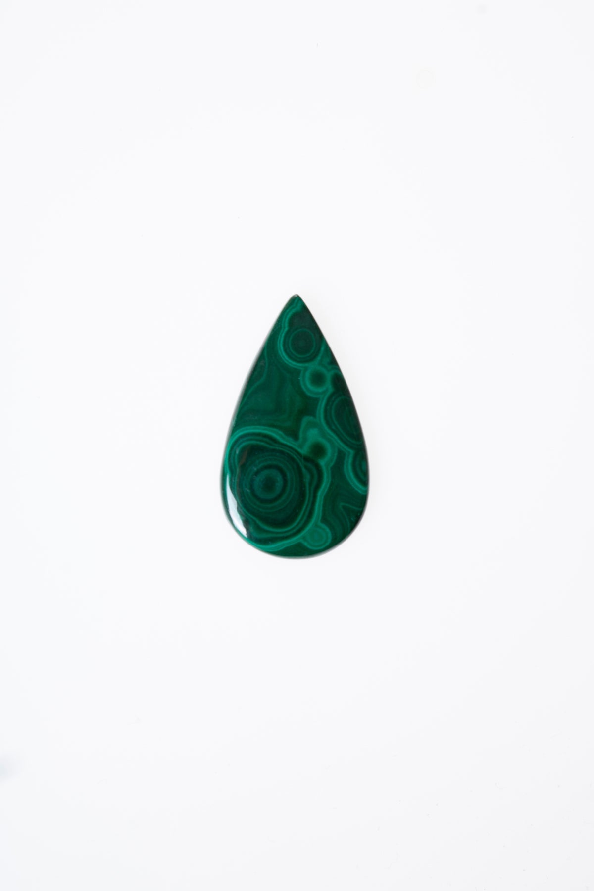 Doğanın en görkemli yeşil tonlarını ve hipnotize edici çizgilerini barındıran Sertifikalı Damla Malahit Kabaşon, kendine has dairesel desenleriyle güçlü bir görsel hikaye sunar. Zarif damla formu, taşın akışkan desenlerini en estetik şekilde sergilerken, tasarımlara sofistike ve modern bir dokunuş katar.