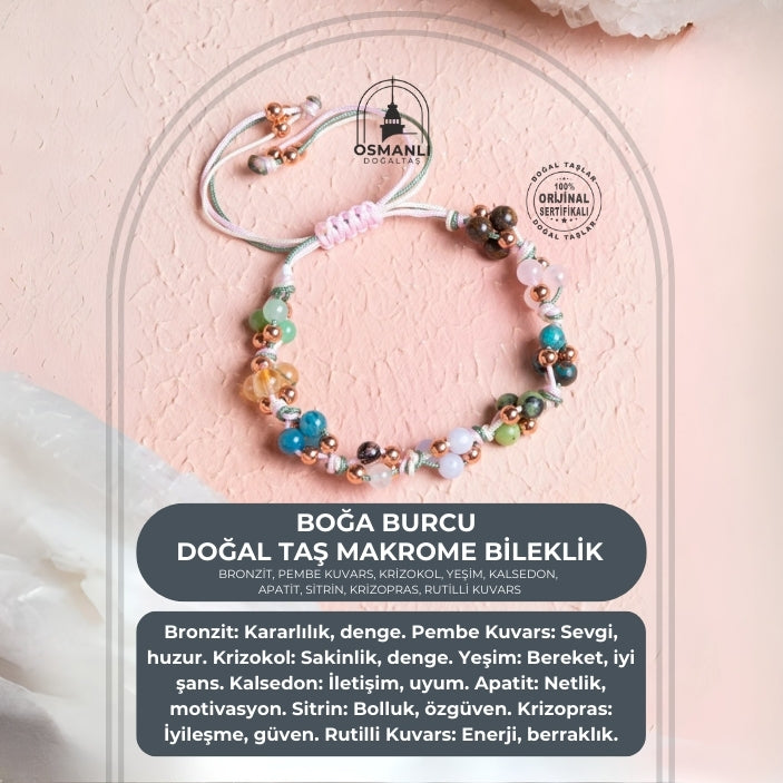 Bu özel makrome bileklik, Boğa burcunun doğayla uyumlu, sabırlı, güven arayan ve estetik zevklere sahip karakterini yansıtan doğal taşlarla tasarlandı: