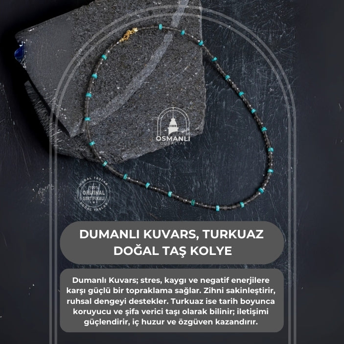 Bu özel kolye, sertifikalı doğal Dumanlı Kuvars ve Turkuaz taşlarının uyumuyla hazırlanmıştır. Her taş, özgün dokusunu ve enerjisini koruyarak el işçiliğiyle dizilmiş, sade ama etkileyici bir tasarıma dönüştürülmüştür.