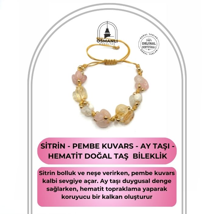 Sertifikalı Hakiki Orijinal Sitrin - Pembe Kuvars - Ay Taşı - Hematit Doğal Taş İpli Merdiven Kapama Bileklik