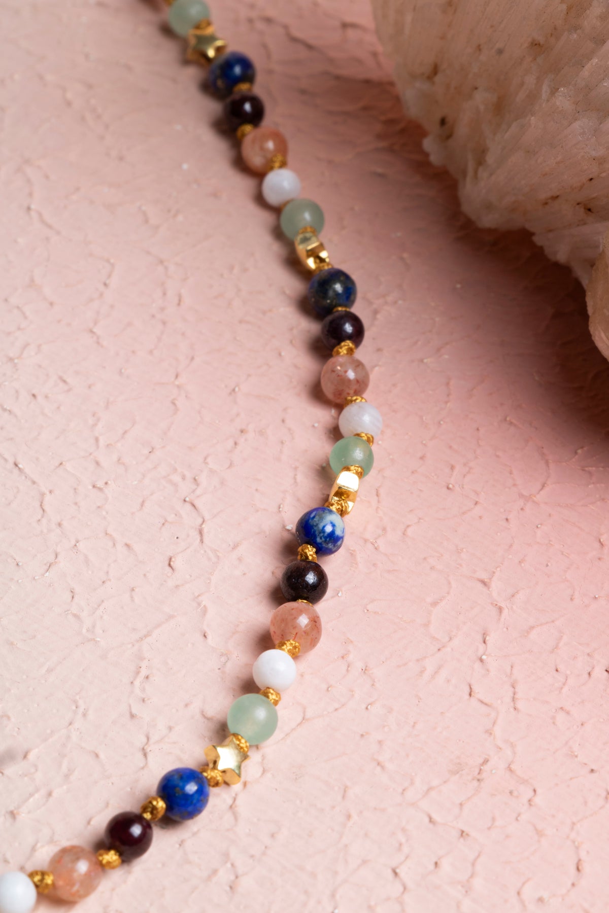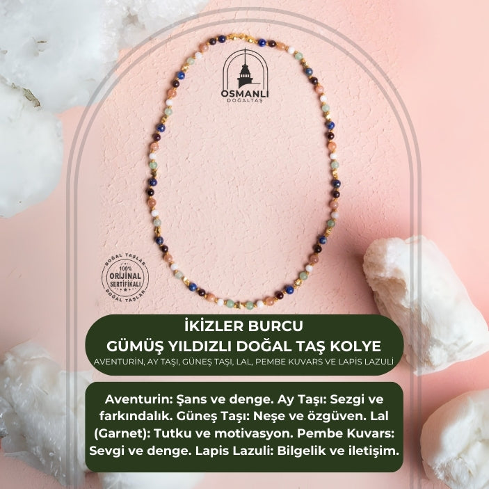 Zeka, iletişim ve merak... İkizler burcunun neşeli, meraklı ve sosyal ruhunu yansıtan bu özel gümüş yıldızlı kolye; Aventurin, Ay Taşı, Güneş Taşı, Lal, Pembe Kuvars ve Lapis Lazuli enerjisiyle tasarlandı.