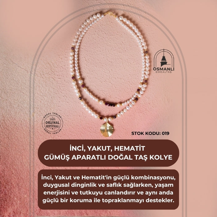 Zarafeti, tutkuyu ve korumayı tek bir özel tasarımda birleştirin. İnci'nin saflığı, Yakut'un ateşi ve Hematit'in topraklayıcı gücü, şık bir Gümüş Aparat ile tamamlanarak bu özel kolyede buluşuyor. Bu kolye, sadece estetik bir aksesuar değil, aynı zamanda duygusal denge, yüksek enerji ve güçlü koruma sağlayan bir enerji kaynağıdır.