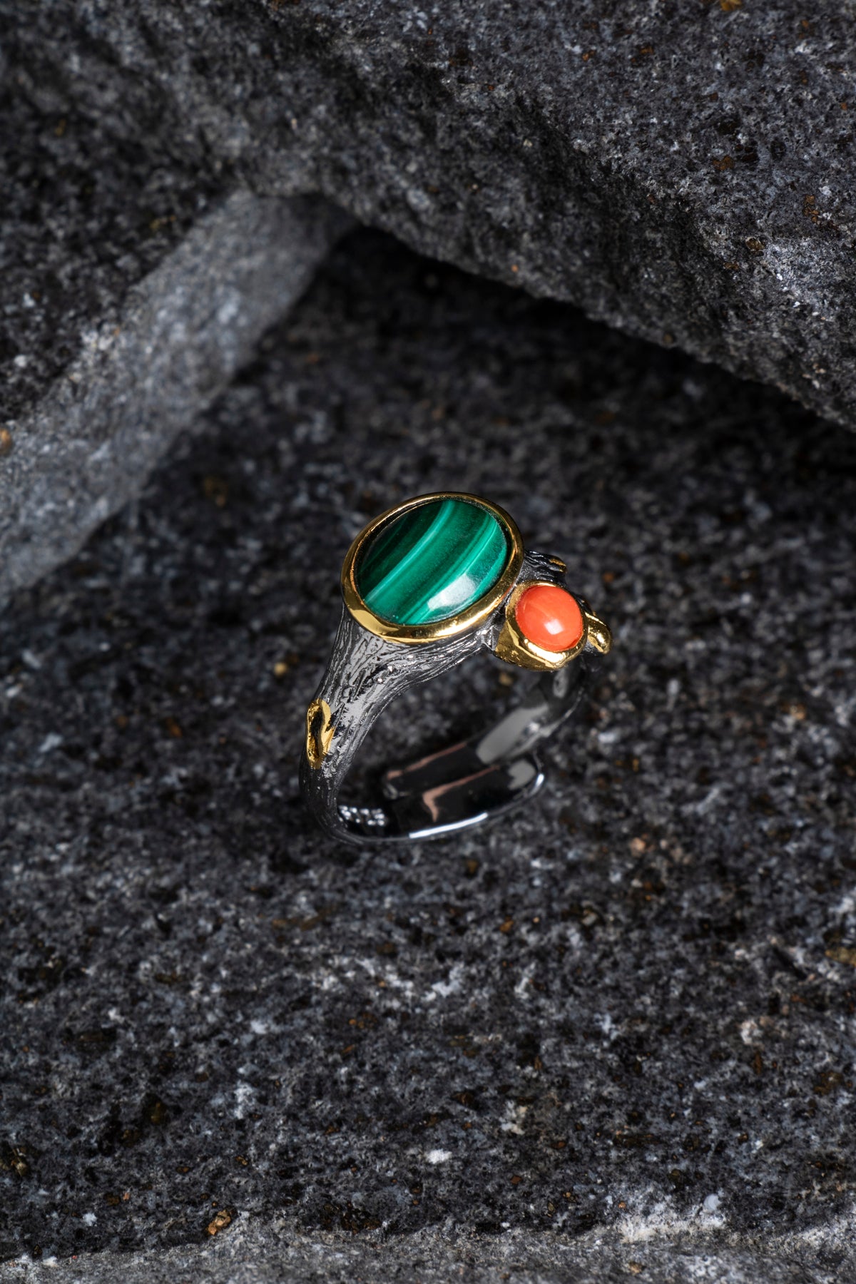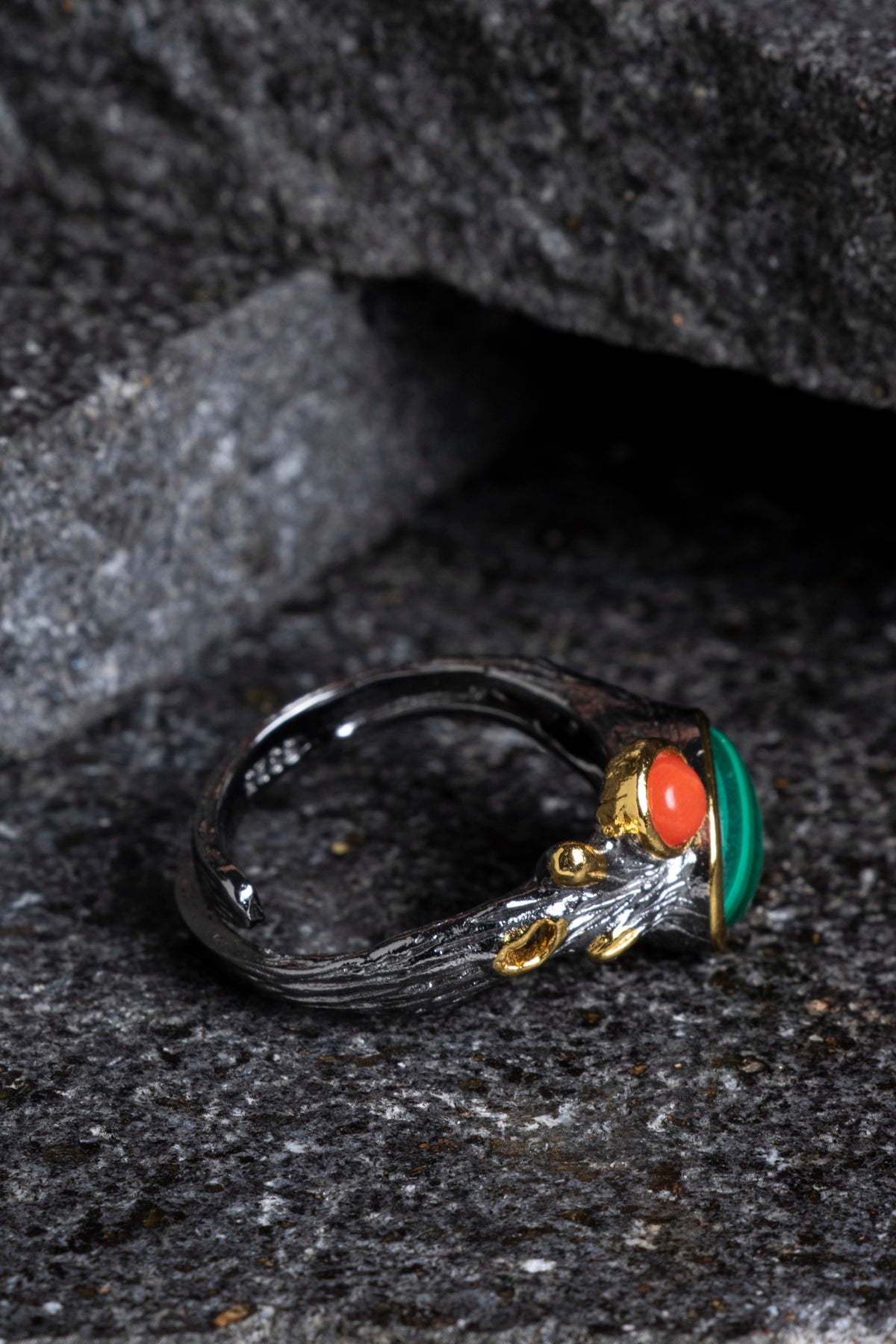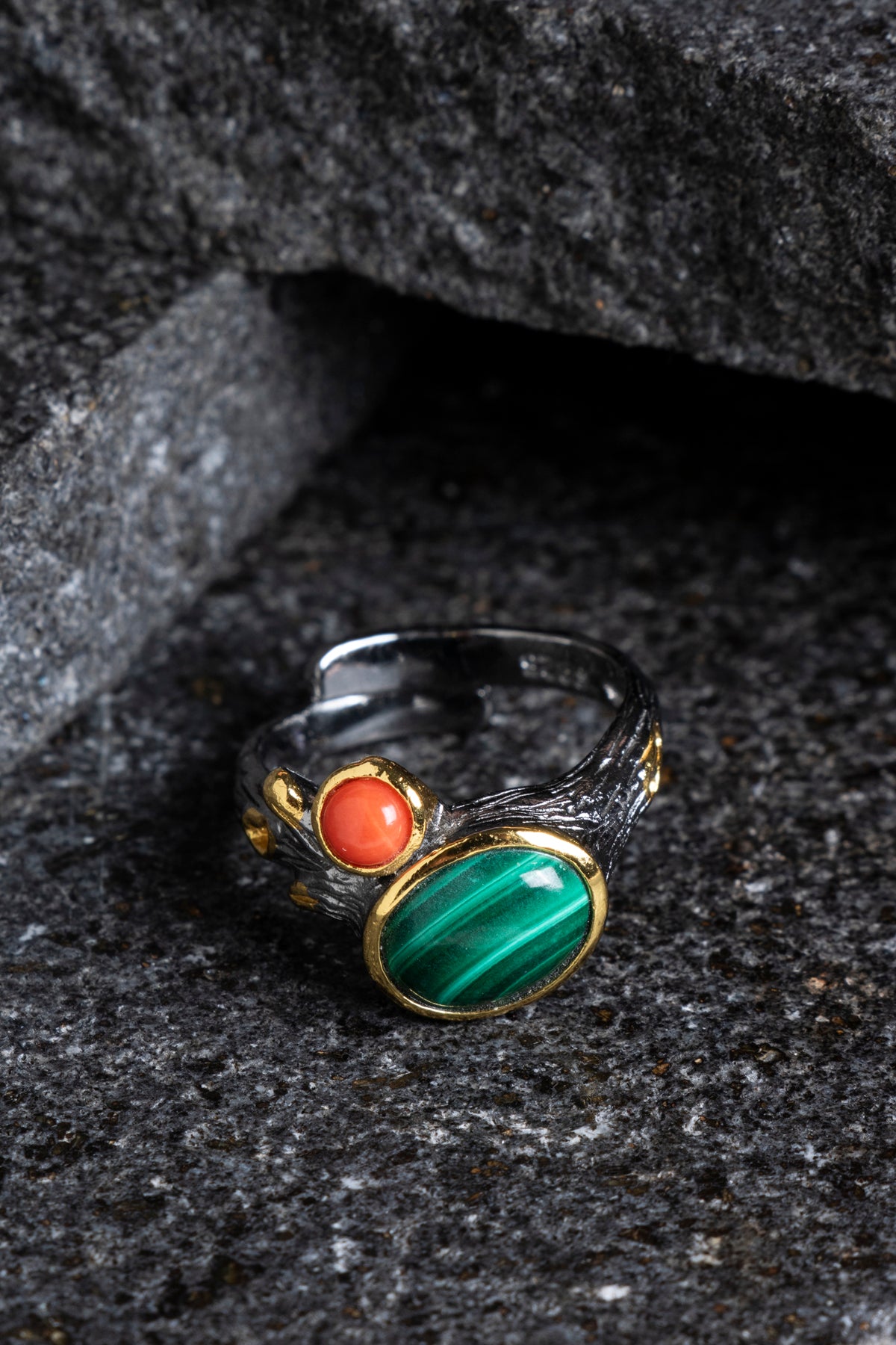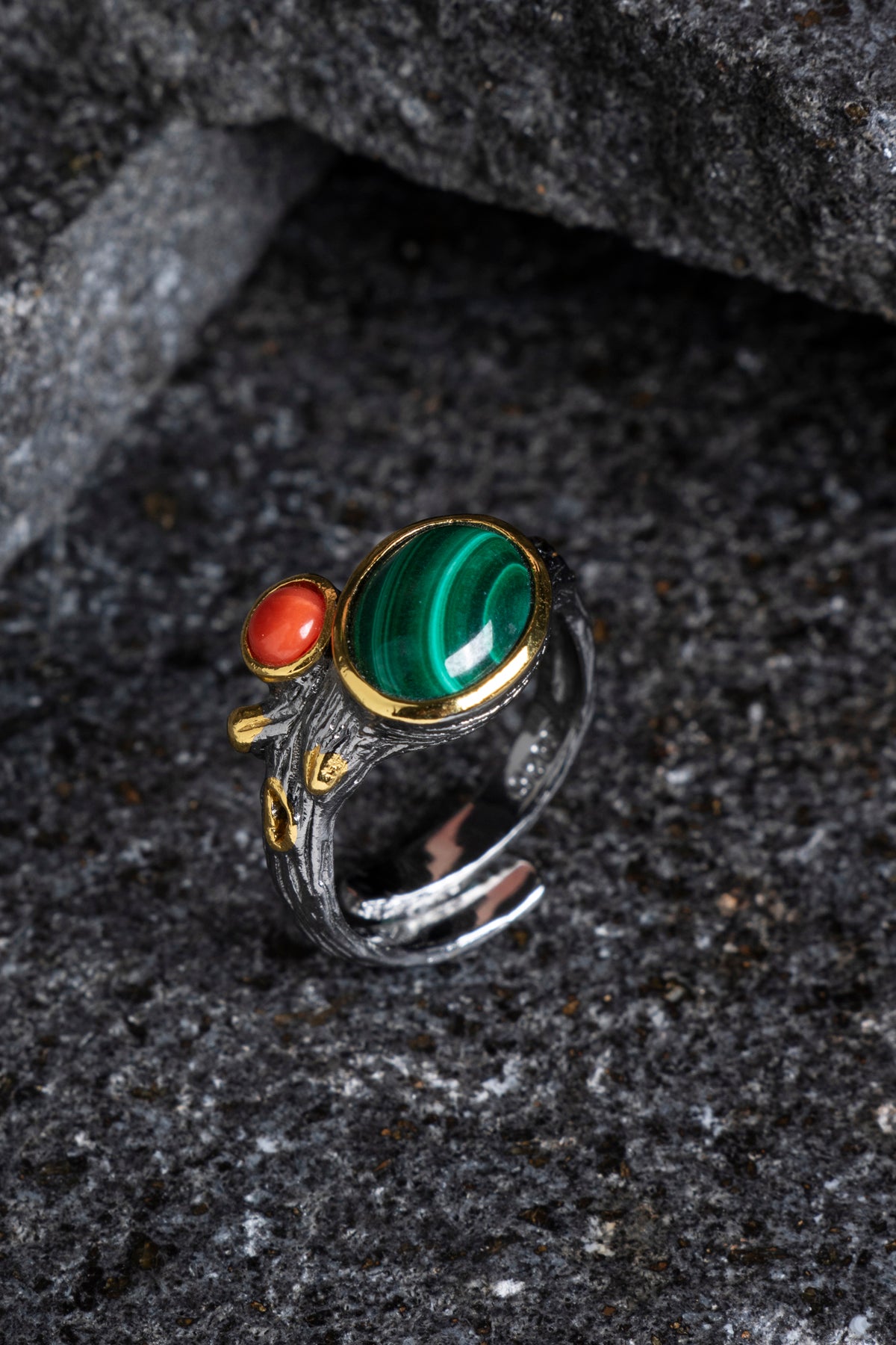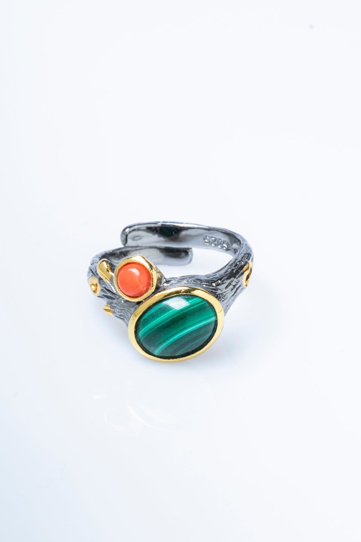 Bu yüzük, orijinalliği ve kalitesi onaylanmış Sertifikalı Malahit ve Mercan taşları kullanılarak üretilmiştir. Canlı renklerin ve desenlerin ahenkli birleşimi, stilinize derin bir anlam katacaktır.