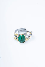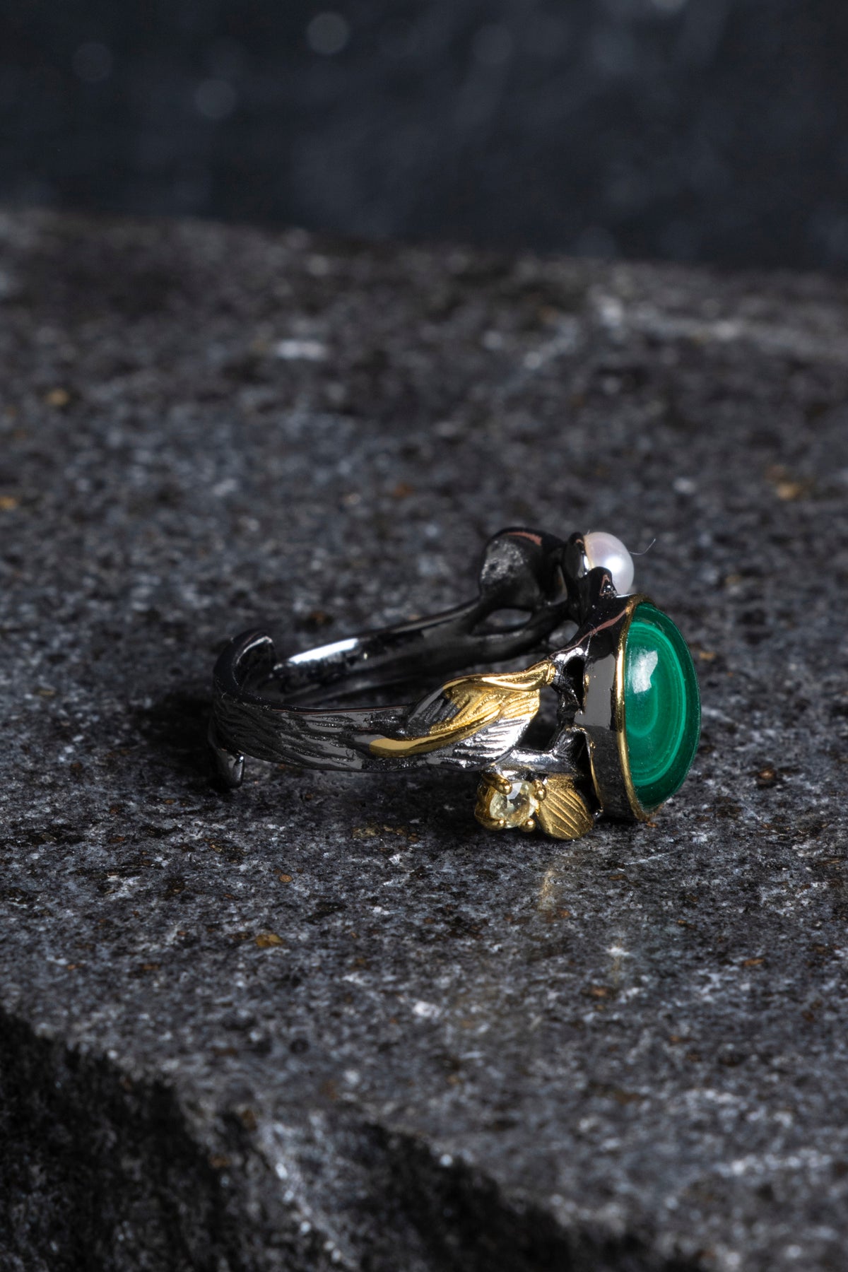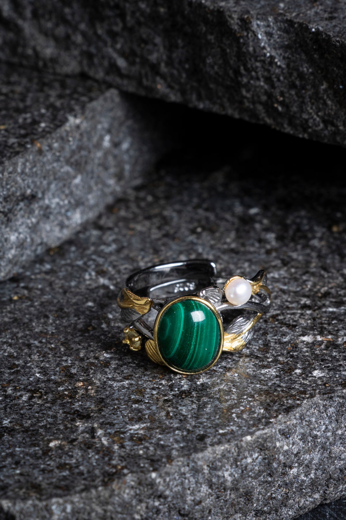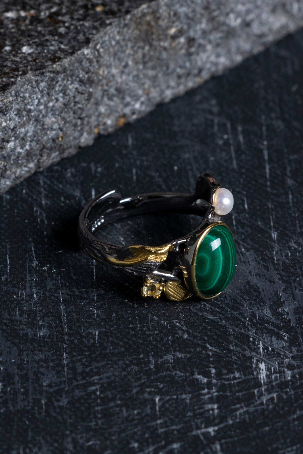 • Canlı Desenler ve Zarafet: Malahit'in kendine has canlı yeşil katmanlı desenleri, yüzüğe sanatsal ve hipnotize edici bir güzellik katar.