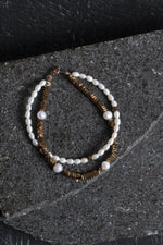 Bu yakın plan görsel, önceki ürün görselinde yer alan inci ve hematit taşlarından oluşan kolye & bileklik takımının detaylarını sergiliyor. Taşların parlaklığı, doğal inci formu ve hematitin metalik yapısı oldukça net biçimde görünmekte.