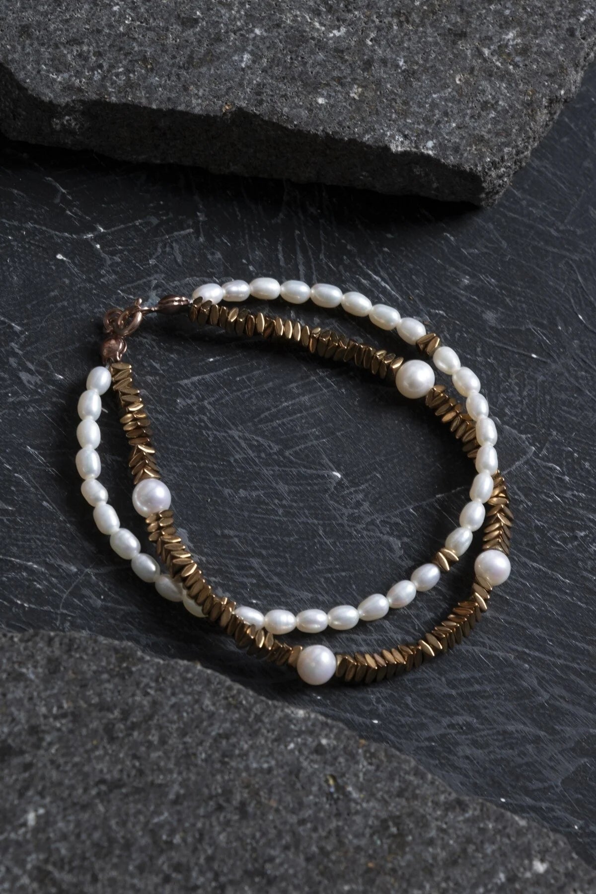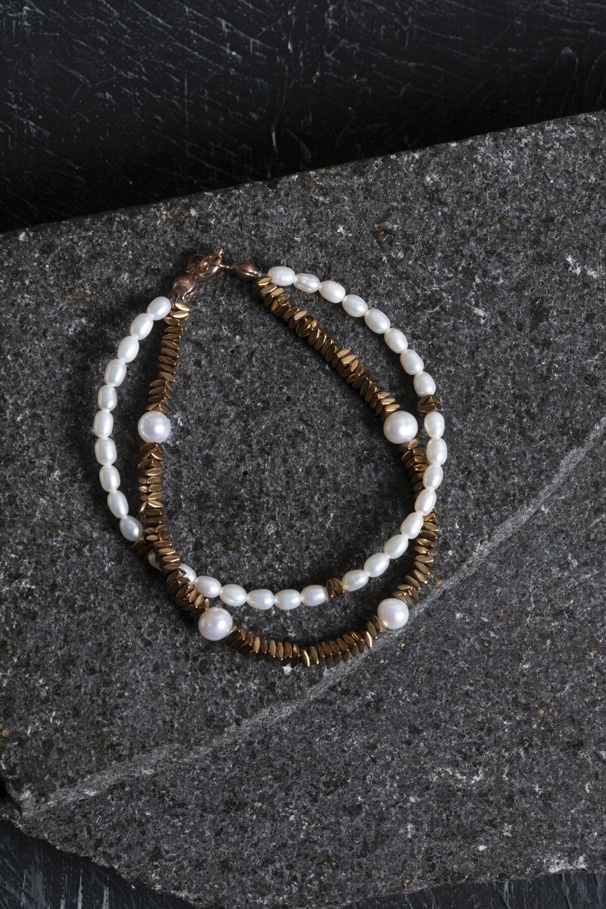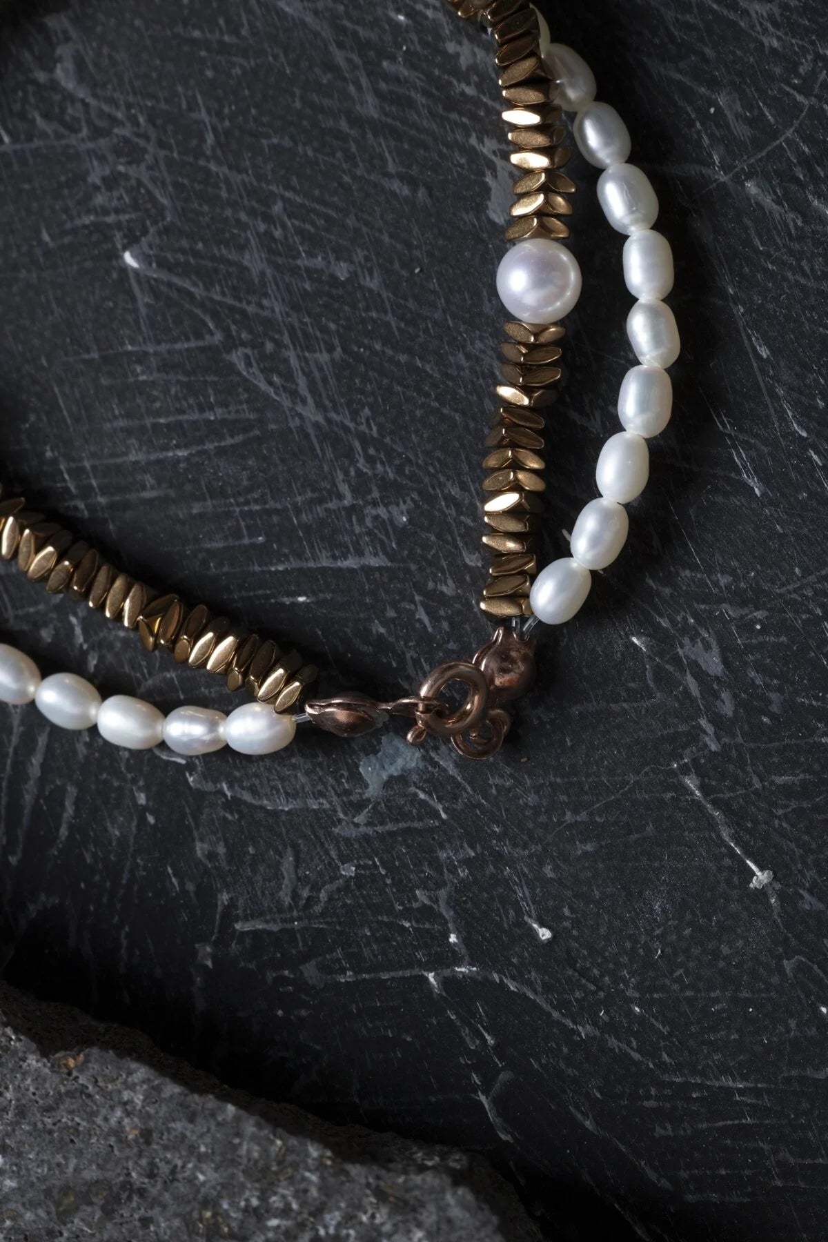 “Parlak doğal inciler ve metalik hematit taşlarının ustaca birleştirildiği bu tasarım, şıklığın ve doğallığın birleşimidir. Yakın plandan ürünün zarafetini ve işçiliğini keşfedin.”