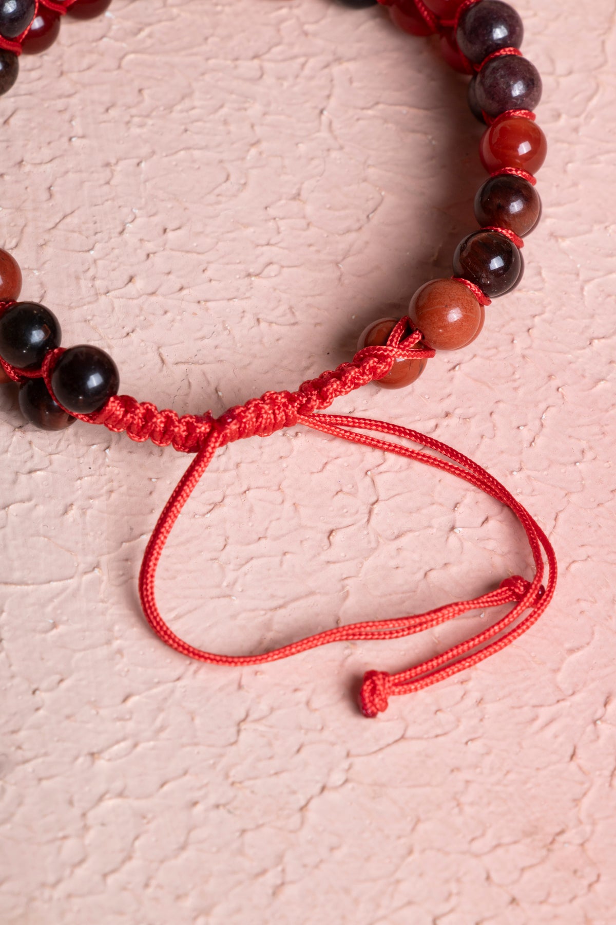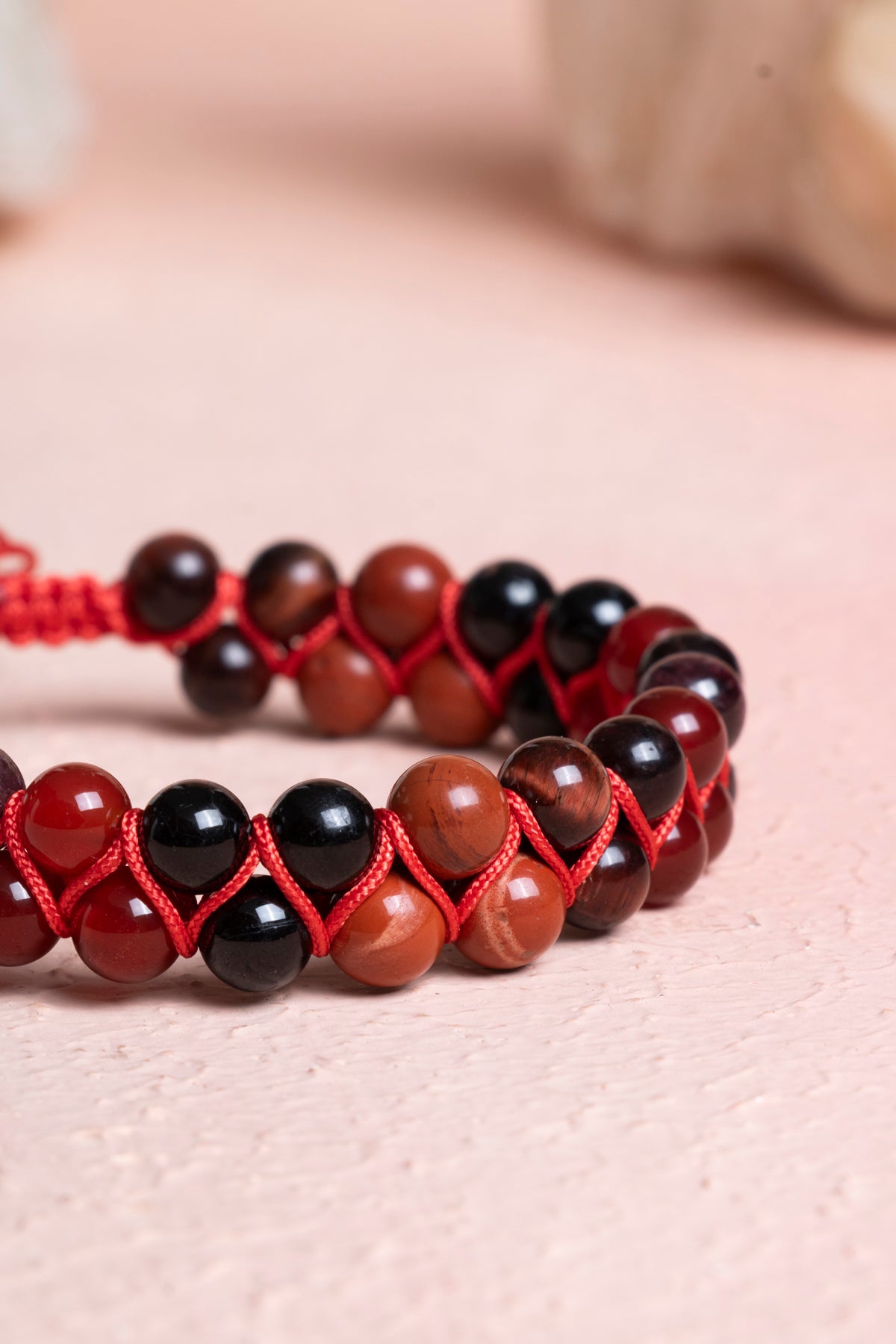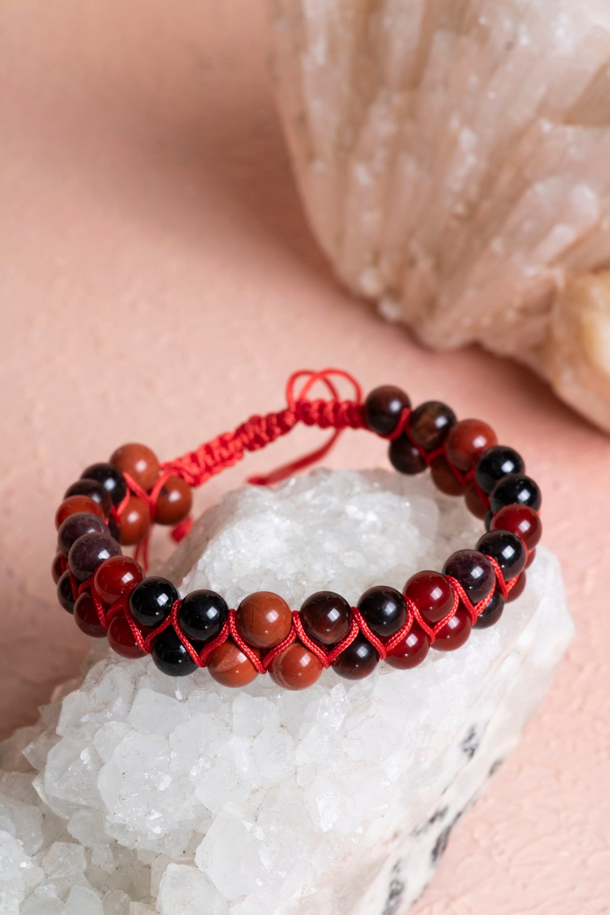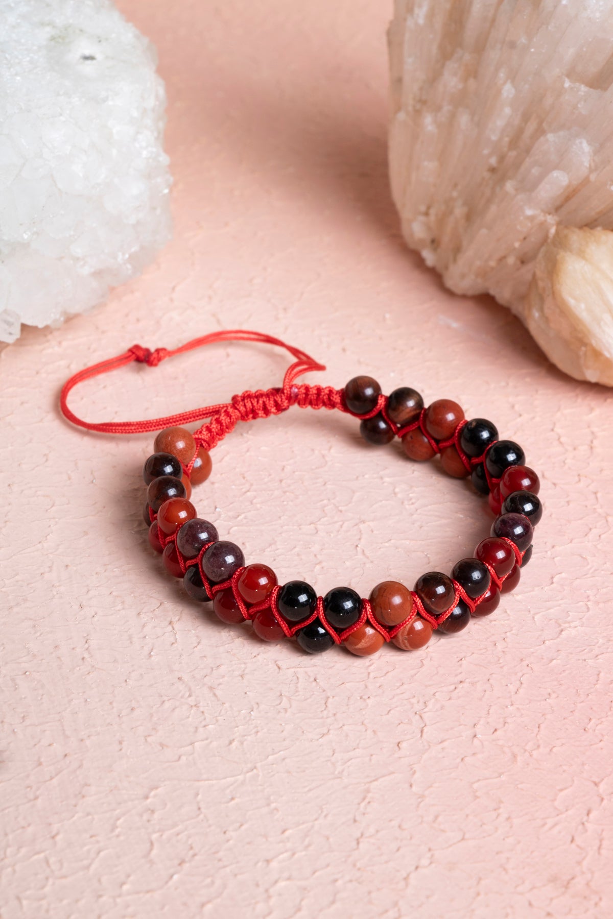 Bileklik, sizi yeryüzüne bağlayan ve yaşam enerjinizi yükselten %100 doğal ve sertifikalı Kırmızı Kaplan Gözü, Kırmızı Jasper, Siyah Turmalin, Lal ve Kırmızı Akik (6mm) taşları ile elde örüldü. Bu taşların birleşimi, kendinizi güvende hissetmenize ve hayata daha sağlam adımlarla ilerlemenize yardımcı olur.