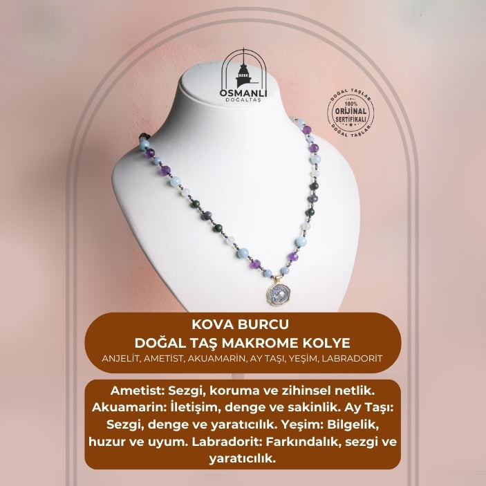 Özgünlük, entelektüellik ve vizyon... Kova burcunun özgür, yenilikçi ve hümanist ruhunu yansıtan bu özel makrome kolye; Anjelit, Ametist, Akuamarin, Ay Taşı, Yeşim ve Labradorit enerjisiyle tasarlandı.