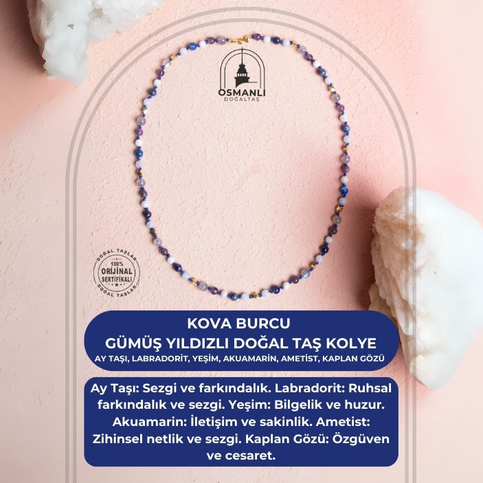 Özgünlük, entelektüellik ve vizyon... Kova burcunun özgür, yenilikçi ve hümanist ruhunu yansıtan bu özel gümüş yıldızlı kolye; Ay Taşı, Labradorit, Yeşim, Akuamarin, Ametist ve Kaplan Gözü enerjisiyle tasarlandı.