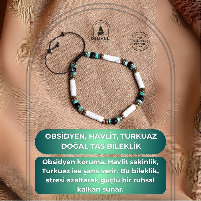 Sertifikalı Obsidyen, Havlit, Turkuaz Doğal Taş Makrome Bileklik