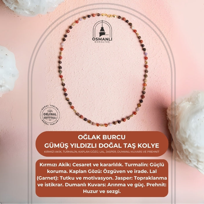 Disiplin, kararlılık ve azim... Oğlak burcunun sorumlu, sabırlı ve hedef odaklı enerjisini yansıtan bu özel gümüş yıldızlı kolye, Kırmızı Akik, Turmalin, Kaplan Gözü, Lal, Jasper, Dumanlı Kuvars ve Prehnit enerjisiyle tasarlandı.