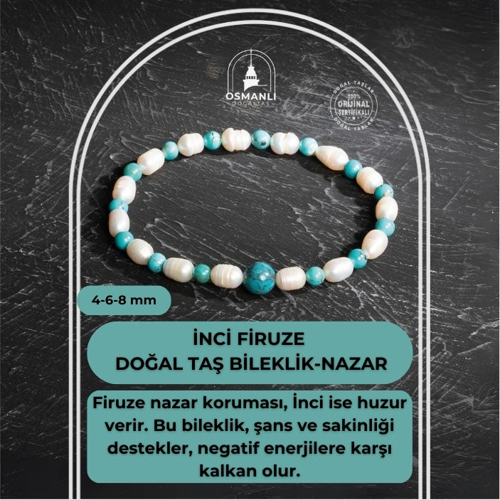 Sertifikalı Orijinal İnci Firuze Doğal Taş Bileklik-Nazar 4mm-6mm-8mm
