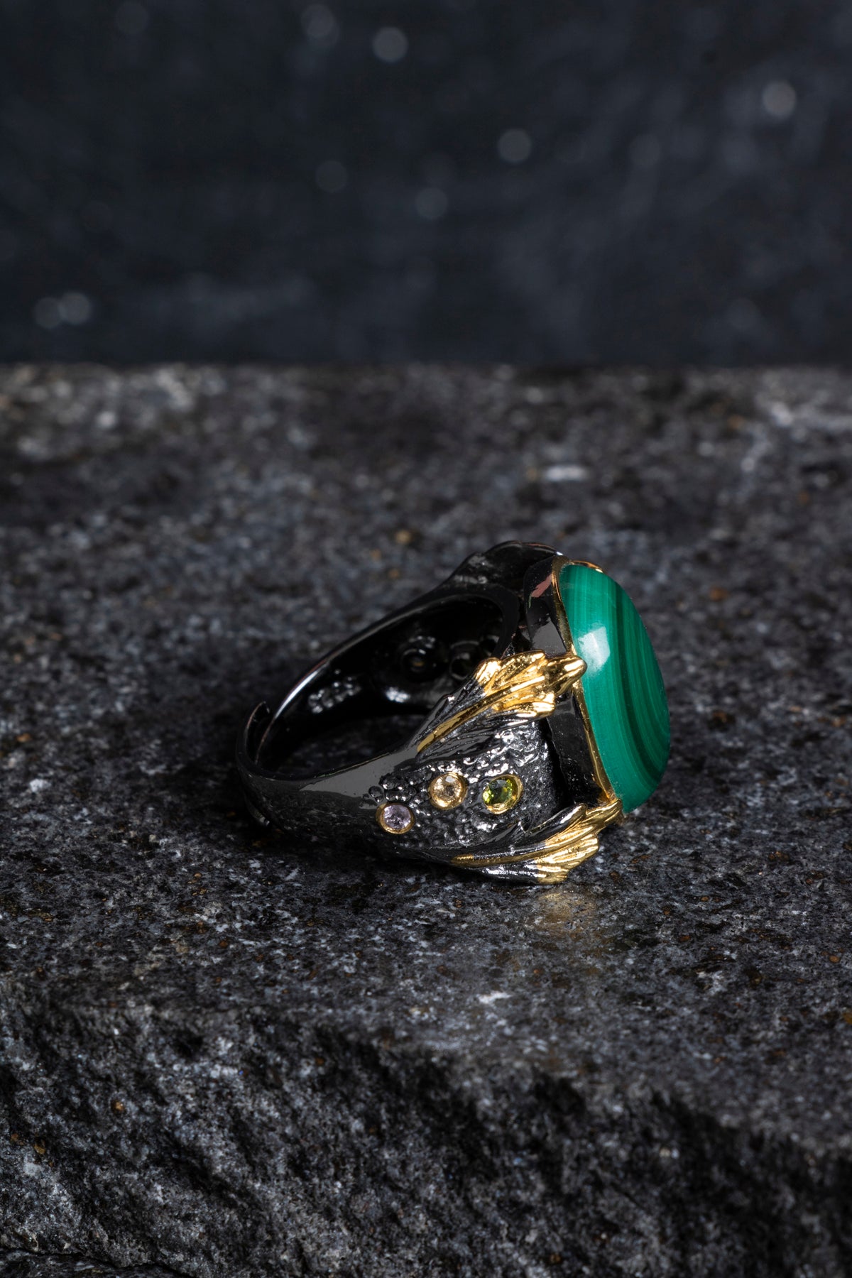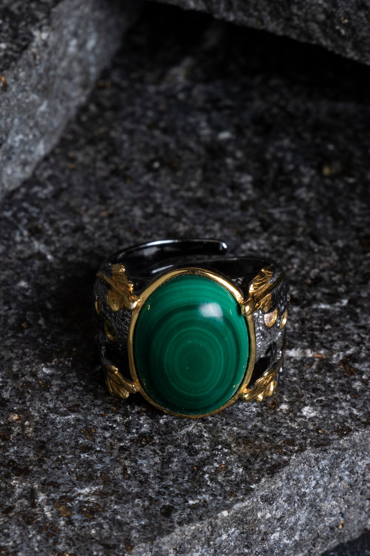 Bu yüzük, orijinalliği ve kalitesi onaylanmış Sertifikalı Malahit taşı kullanılarak üretilmiştir. Taşın canlı desenleri, İridyumlu Gümüş detaylarla birleşerek göz alıcı ve asil bir estetik sunar.