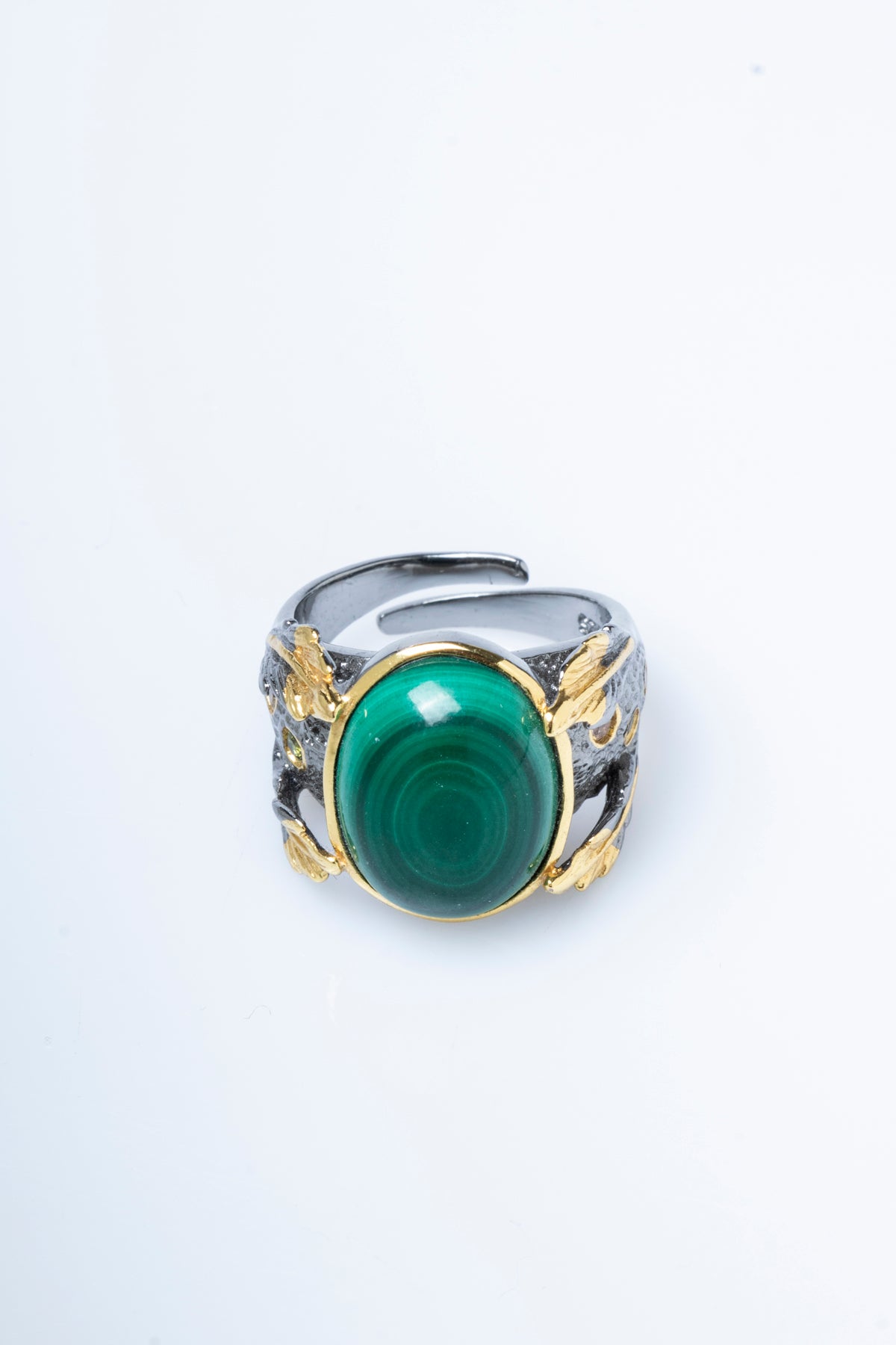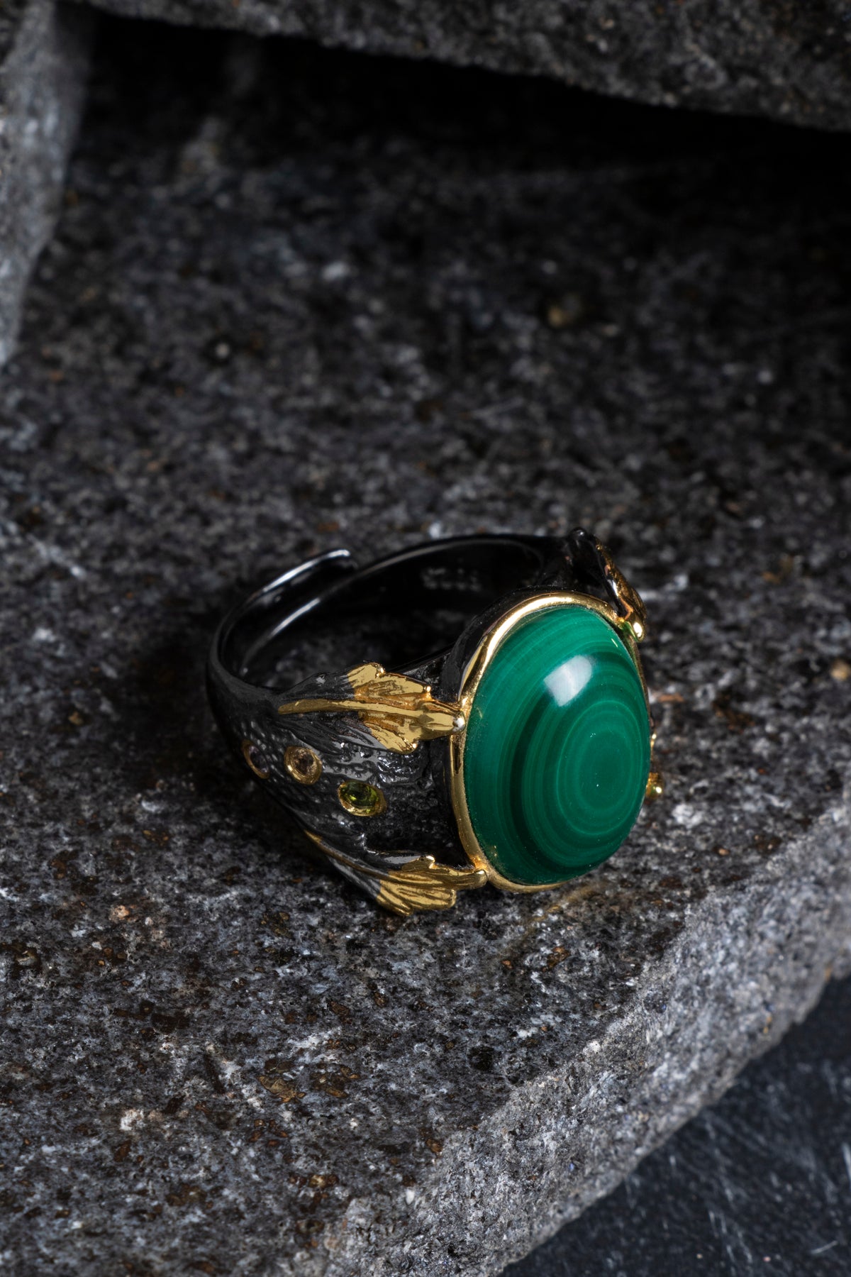 Canlı Desenler ve Zarafet: Malahit'in kendine has canlı yeşil katmanlı desenleri, yüzüğe sanatsal ve hipnotize edici bir güzellik katar.