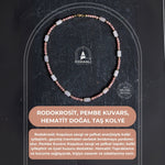 Sertifikalı Rodokrozit, Pembe Kuvars, Hematit Doğal Taş Kolye