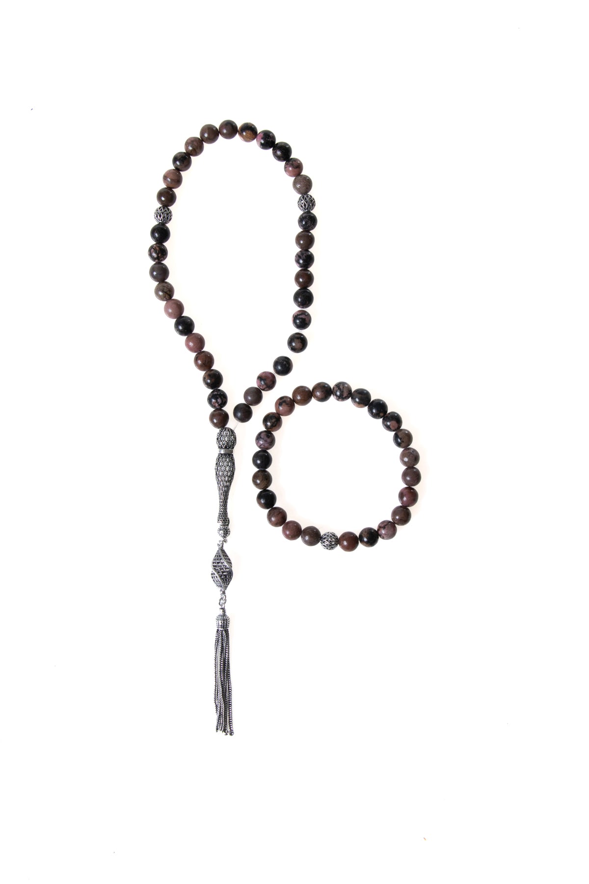 Sertifikalı Rodonit 925 Ayar Gümüş 8 mm İmameli Tesbih & Bileklik Seti